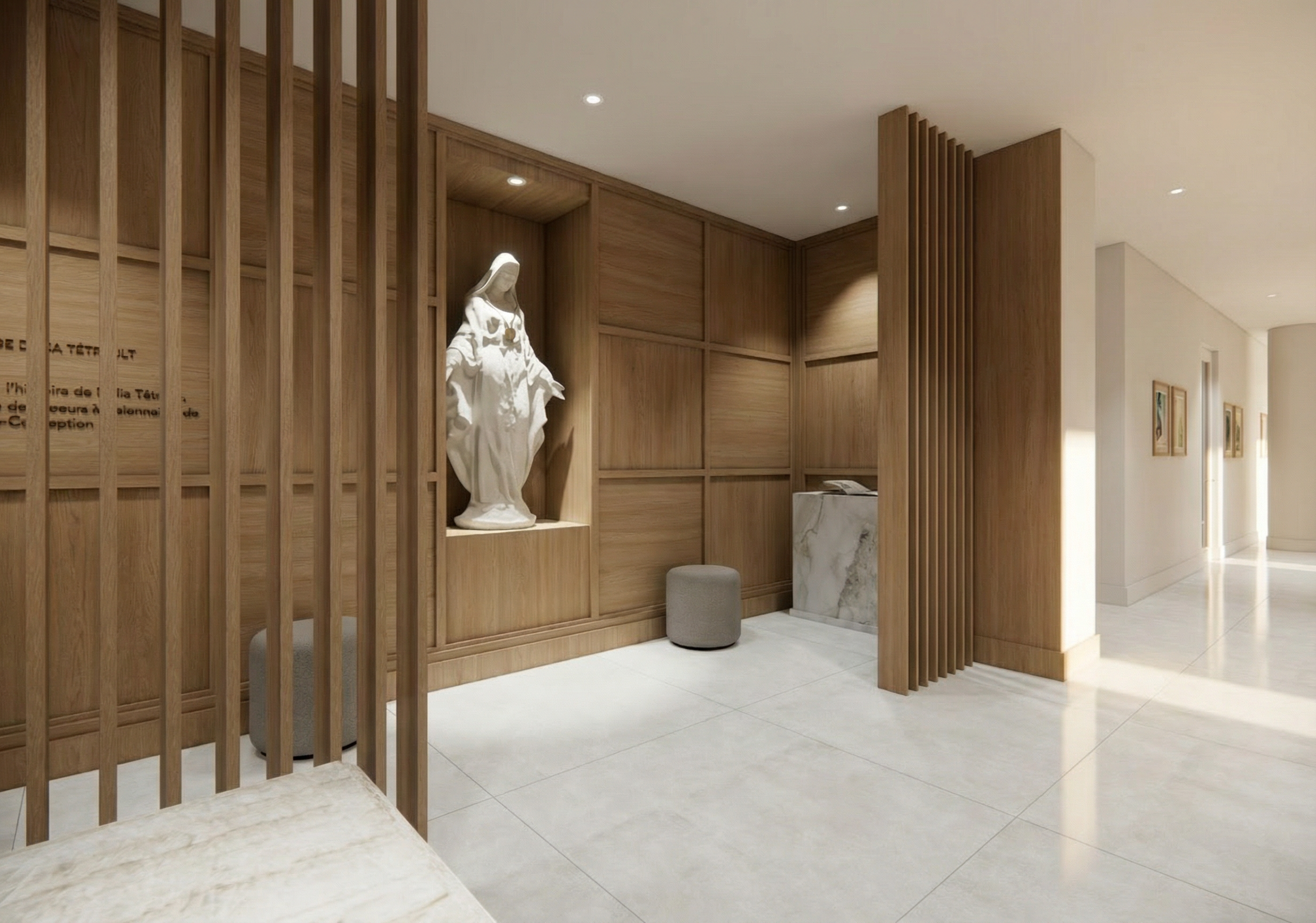 create a highly realistic architectural digest style render of a refined luxury powder room the space should feel intimate sculptural and softly minimal with warm natural lighting subtle shadows and elevated material realism all walls are finished in portola paint brooks in roman clay finish appearing as a bright white with warm creamy undertones and a soft plaster like texture the finish should feel hand applied with subtle tonal variation depth and natural imperfections that respond beautifully to light there is one feature accent wall section on the left side of the vanity finished in ann sacks salluto sticks mosaic bianco natural rectified marble tile this tile should read crisp refined and architectural with soft matte polish and subtle veining it should feel intentional but restrained acting as a textural moment behind the lighting flooring is grato picos in exquisite wood floor planks installed in a precise linear layout the wood should feel warm architectural and refined with a soft matte finish natural grain variation and elongated proportions that ground the space floating vanity is crafted from basstone nyc green oasis marble featuring rich organic green tones with natural veining the slab should feel heavy sculptural and honed with a soft matte sheen luxurious earthy and understated vanity mirror is a simple slab mirror no frame no border 24 w x 54 h clean edge to edge reflective glass it should feel minimal architectural and slightly floating on the wall with no detailing or framing whatsoever faucet is the elemento modern column ceiling mounted faucet in bronze finish extending elegantly from the ceiling into the basin the bronze should feel warm brushed and subtly aged never reflective or chrome like lighting includes only one ida wall lamp by st phane parmentier placed on the left tile wall section only acting as a sculptural focal point it should emit warm diffused light enhancing the texture of the tile and casting soft controlled architectural shadows no other sconces or light fixtures should exist in the space overall aesthetic architectural digest editorial realism with modern european restraint and organic luxury focus on tactile material accuracy soft indirect daylight and balanced composition use a 35mm lens perspective at eye level with realistic global illumination gentle depth of field and natural imperfection avoid duplication of lighting incorrect material placement framed mirrors or overly glossy cgi finishes