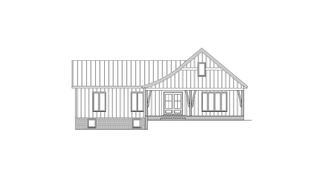 exterior shot a charming cottage style house with distinct vertical board and batten siding painted in soft cream the gable roof features a gentle curve covered in muted sage green metal roofing for a rustic yet modern feel the windows are black with white trim the front door centered beneath a small covered porch is a welcoming black white brick foundation adds stability and charm to the structure the atmosphere is serene and welcoming set under a clear blue sky with golden sunlight casting gentle shadows