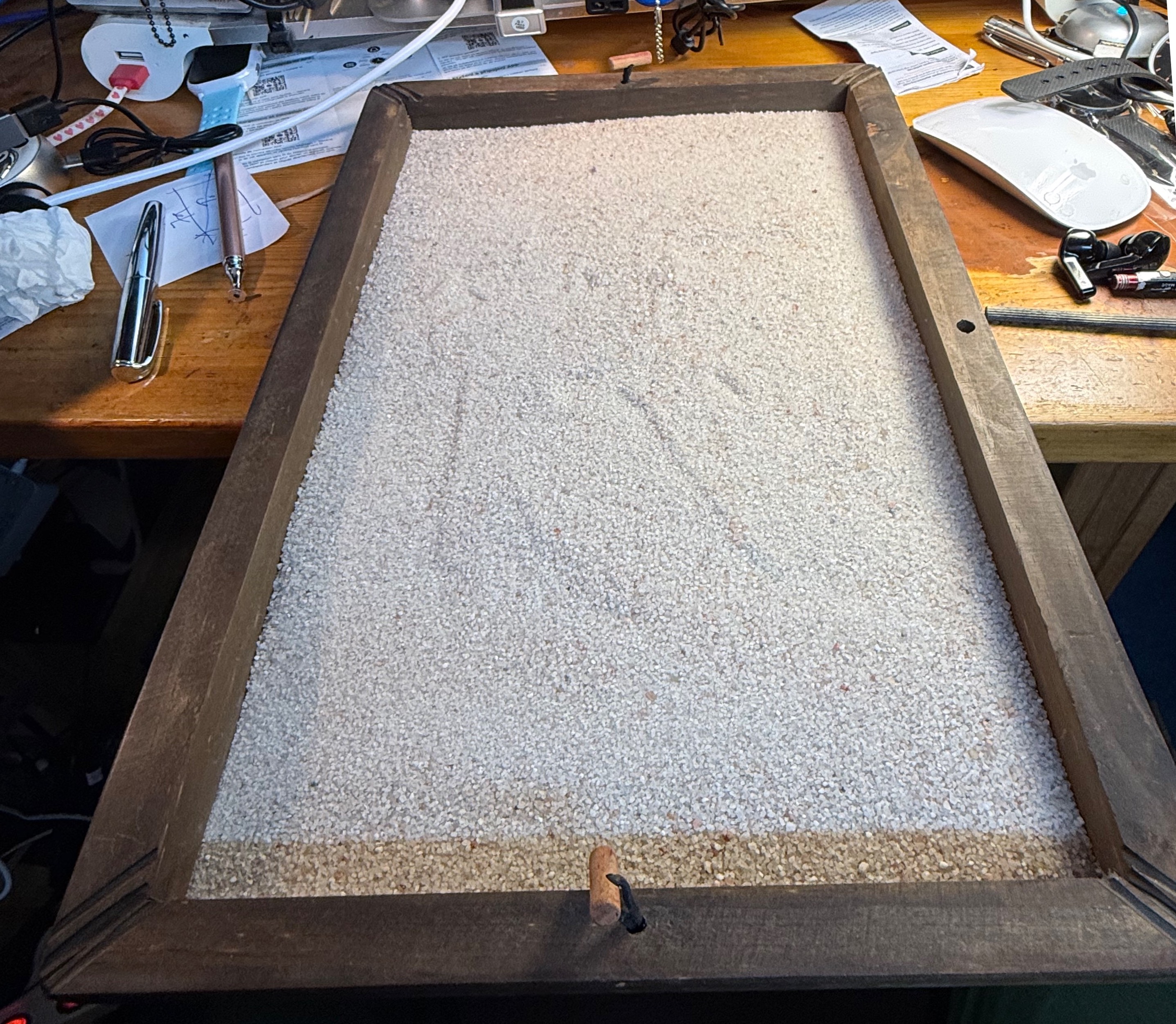 a minimalist japanese garden will be created in the sandy area shown with the sand forming spiral geometric patterns a dry tree will be placed in the first quarter of the northern enclosure and a smooth river stone will be positioned symmetrically on the opposite side along the vertical axis the tree will be mahogany the stone a smooth glossy beige and the sand a medium grained white there will be no elements to suggest the presence of animals