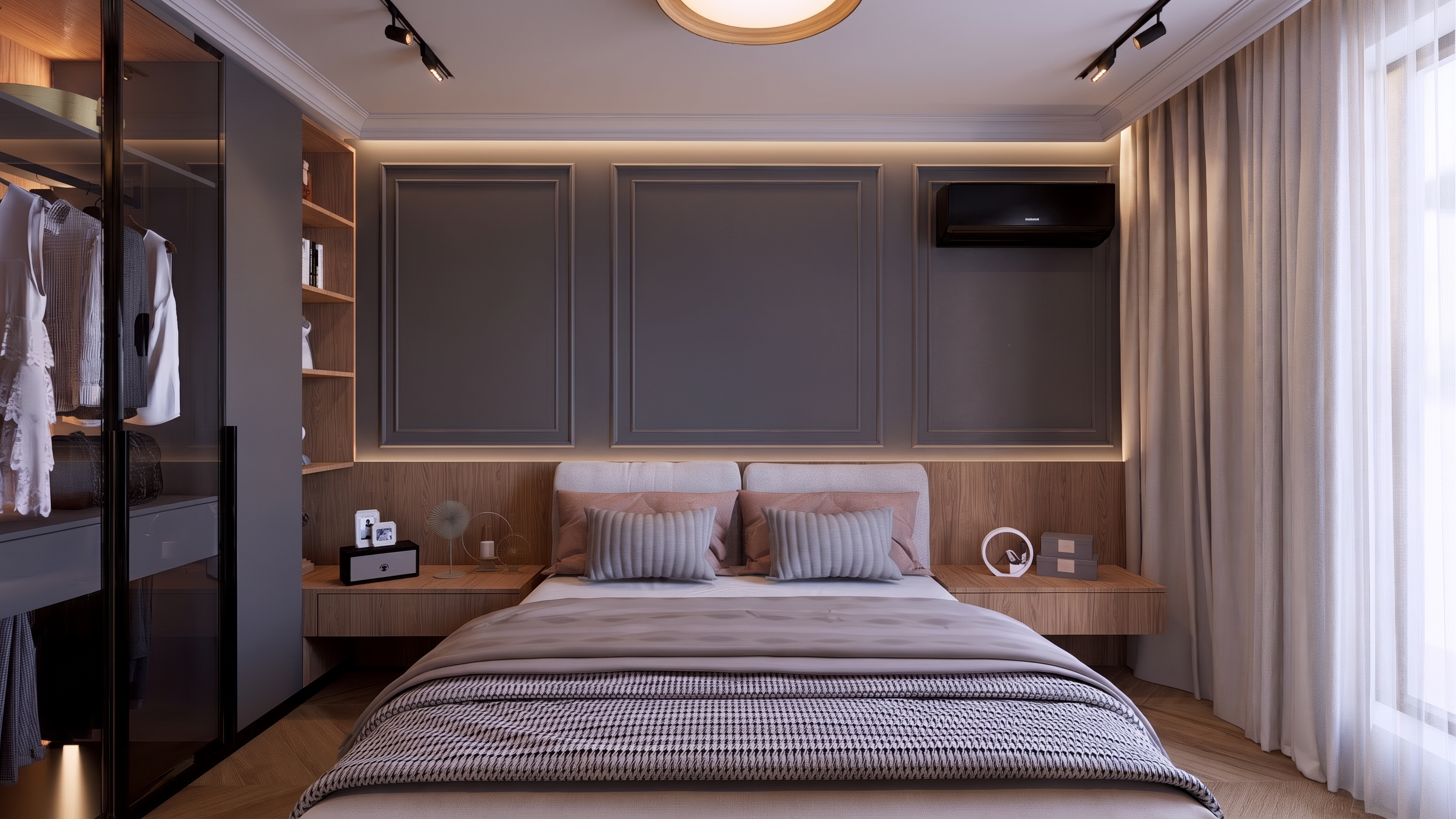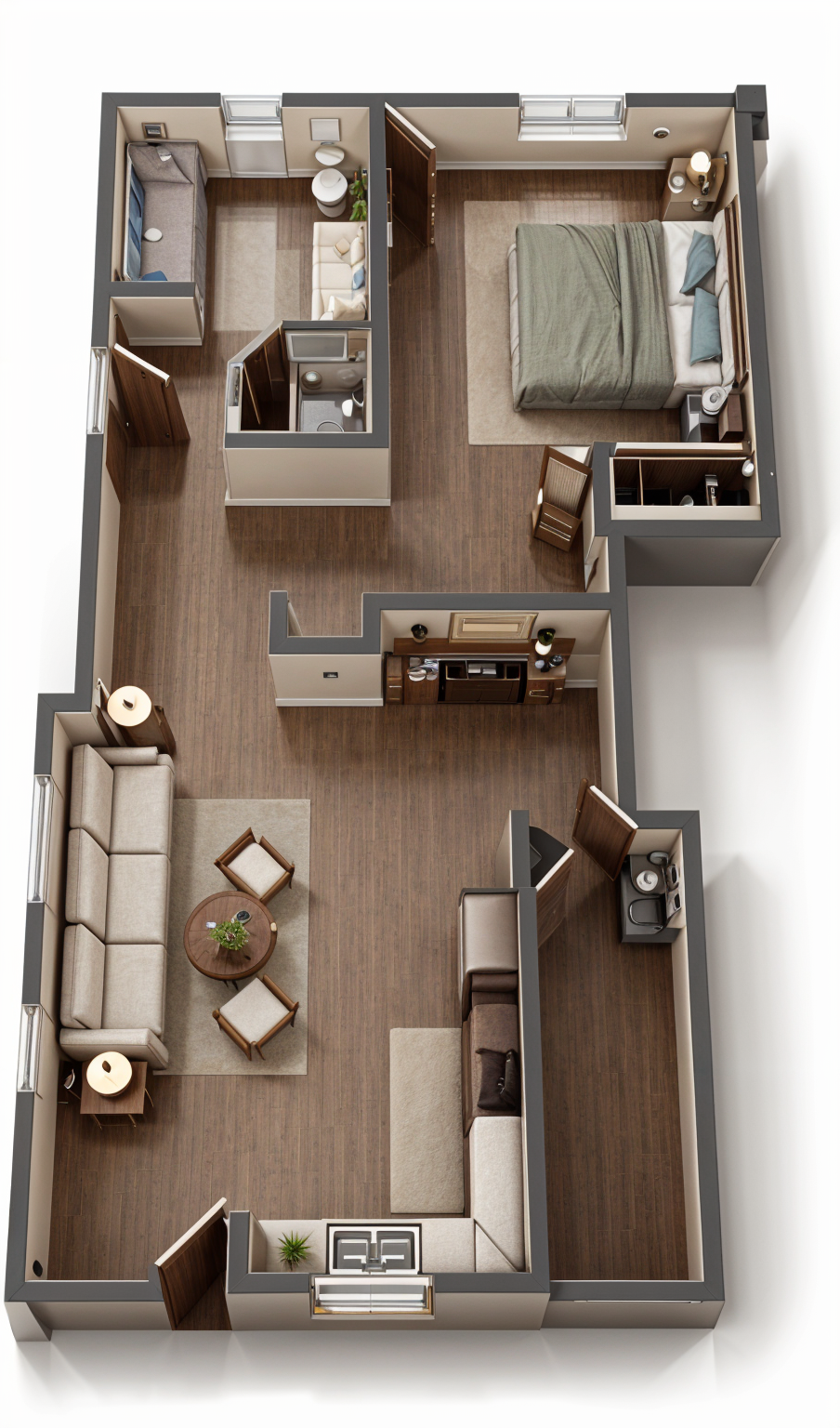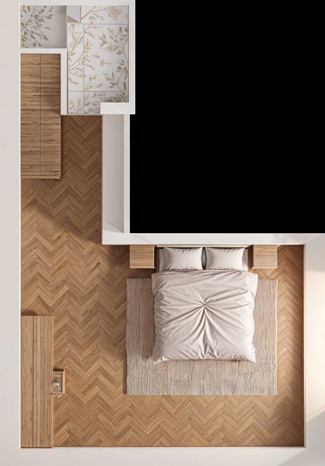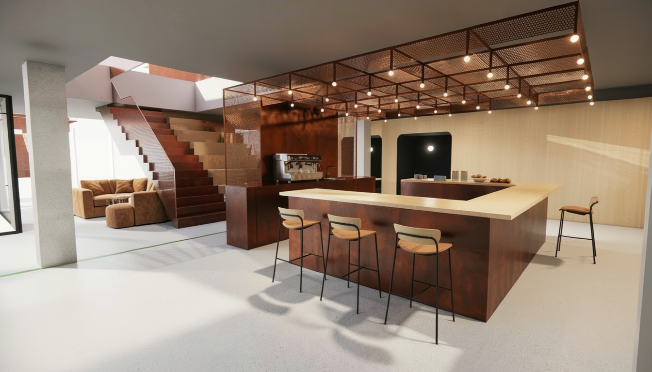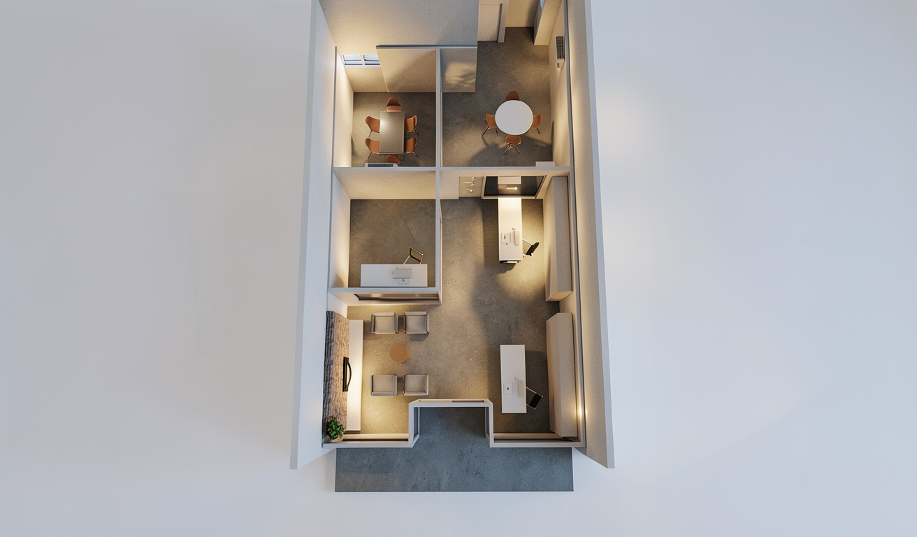 render this office from above add wall lighting add a white background and some light timnber flooring