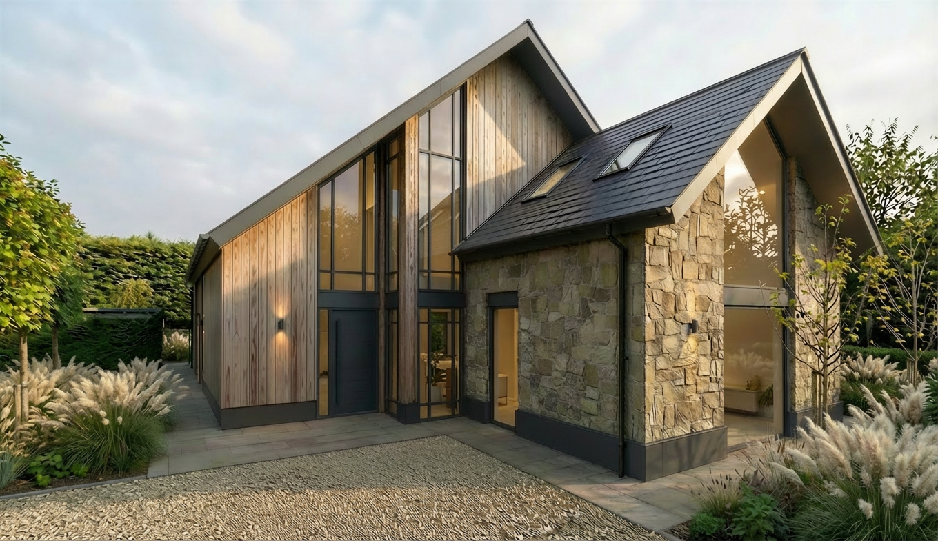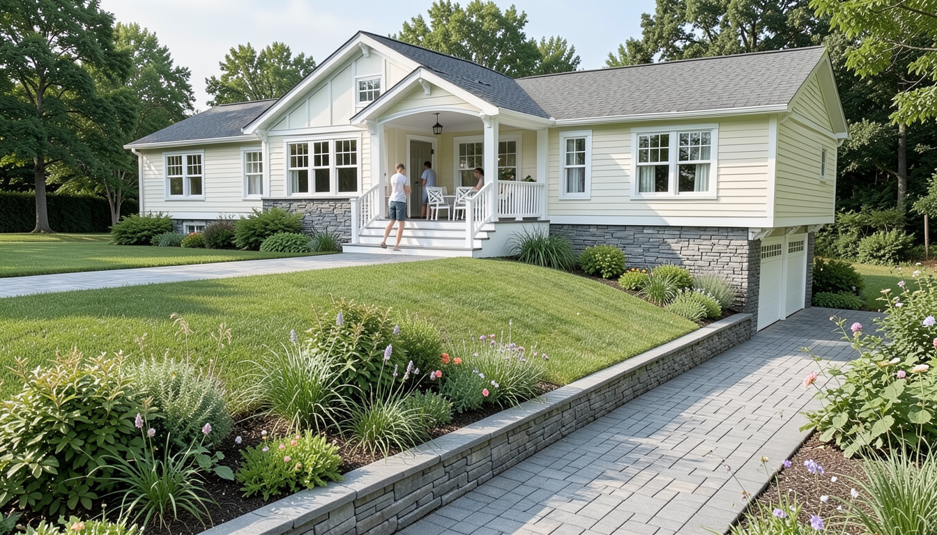 add realistic landscaping make upper level material dark stucco instead of siding make front portico cast stone change lighting to mid day