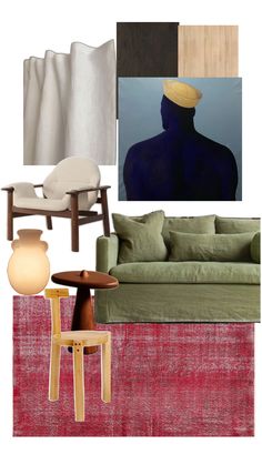 create a cozy modern living room with the following elements a soft olive green sofa as the centerpiece pair it with an elegant dark wood round side table and a distinctive wooden lounge chair with cream cushions add a warm ambient light from a round cream colored lamp on the walls hang a striking abstract painting featuring deep navy blue and subtle golden tones include floor to ceiling curtains in a light linen color to enhance natural light the flooring should feature a textured rich red area rug for added warmth the overall atmosphere should be inviting and stylish with a harmonious blend of natural and artistic elements