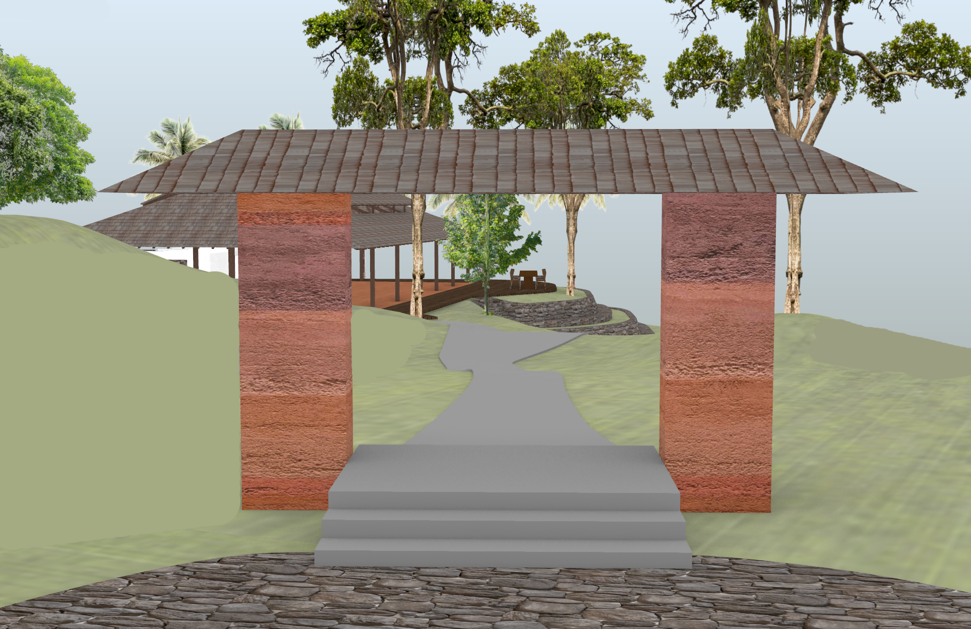 add dense ferns and tropical planting on all the green areas walls made of rammed earth