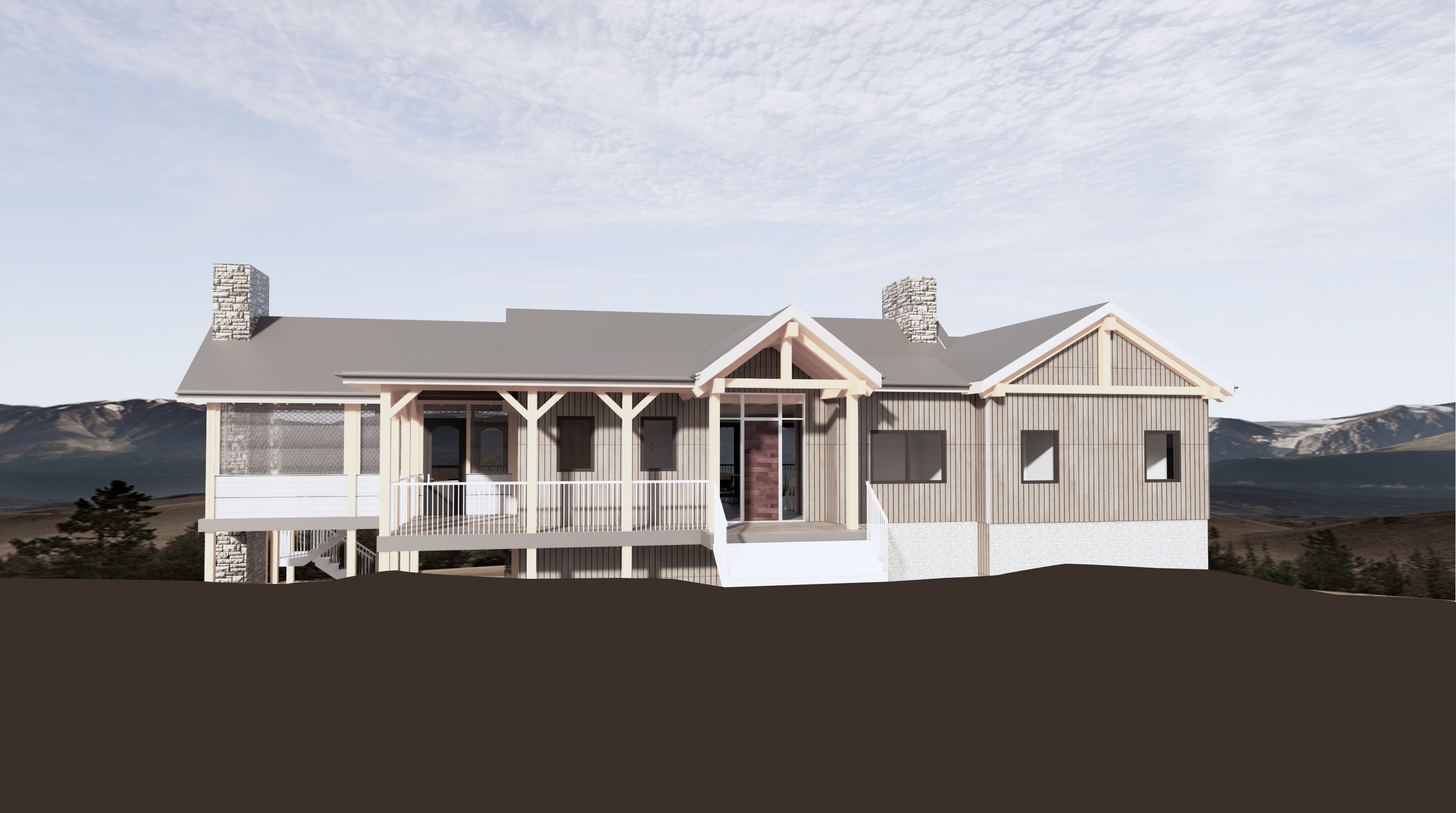 black metal roof dark stained wood wood railings with black steel balusters black window and door frames wood front door dark brown color siding horizontal lap siding and vertical board and batten stone grey tan brown fireplace and stone base screened in porch on left grass in north carolina forest wood front door surrounded by glass on sided and on top in black frame