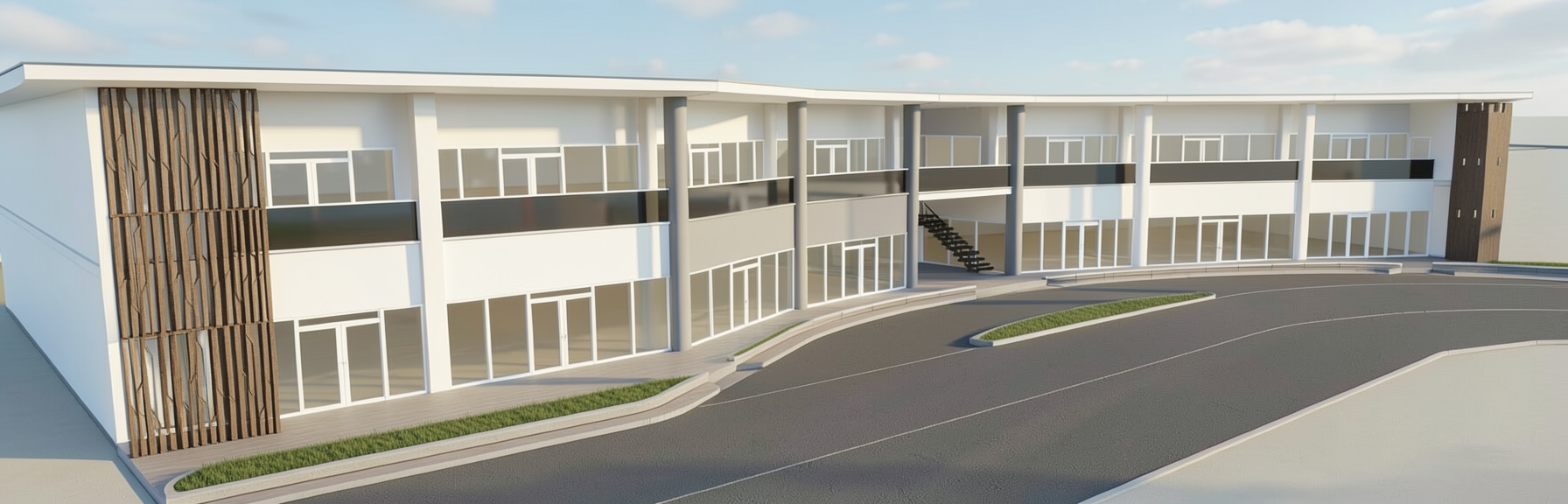 make the pillars in between handrail gray same as youthful grace of nippon paint make the walls nippon paint whispering white make the frames of glass white make the glass clear make the handrails at the second floor brown make the patterened grills blue