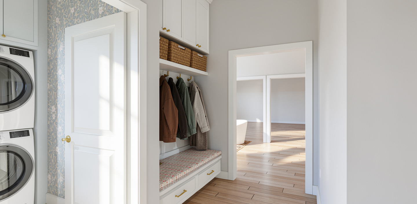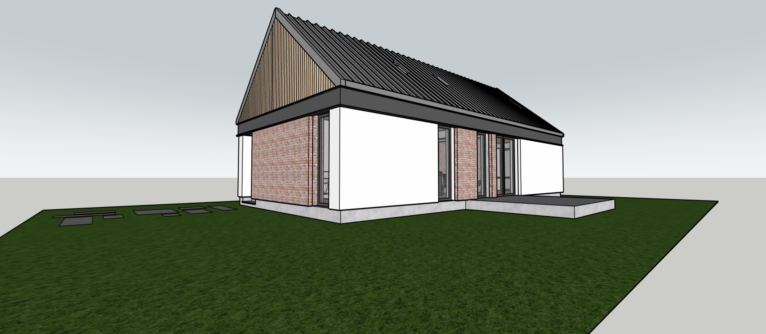 make it look professional put the house between other houses put vegetation around the house small bushes and big trees put clouds on the sky keep the texture light wood old brick metal sheet gray for the roof gray beam between grownd floor and first gloor but make it elegant put lights inside the house do not modify anithing elese at the design just make the texture as i said and the surroundings