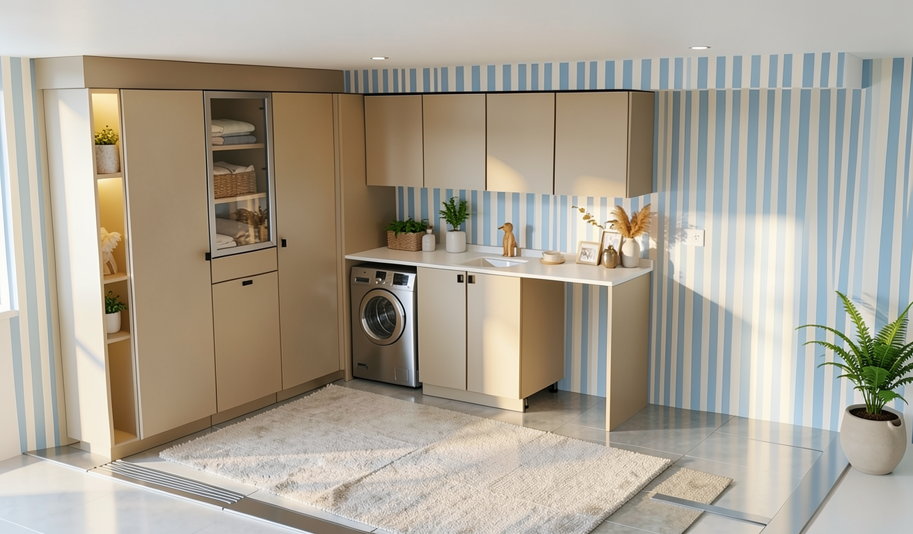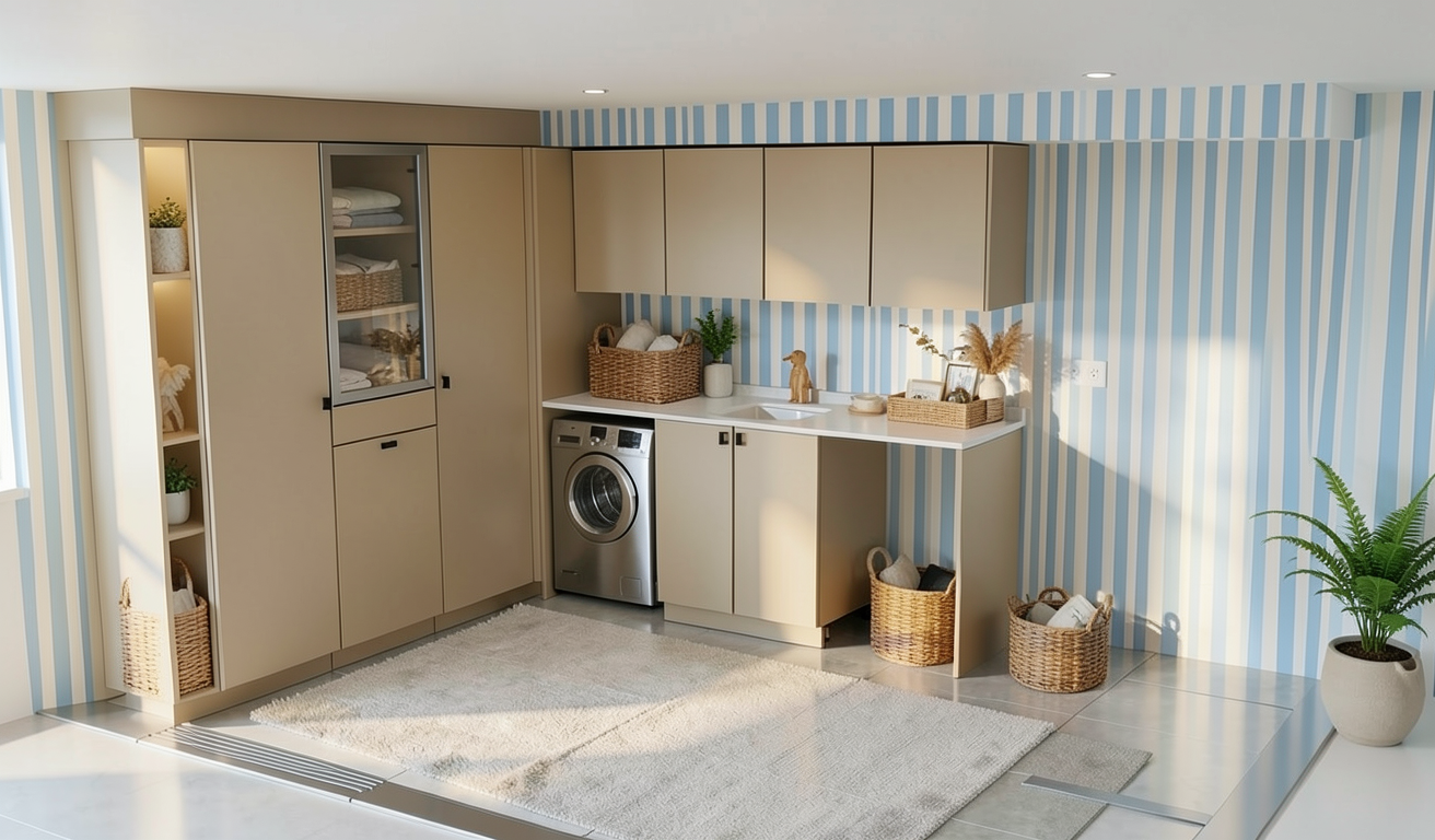quita los cestos y la decoracion que esta en el suelo quita toda la decoracion que esta sobre la encimera y pon una griferia pon cesta de ropa sobre la encimera pon otra lavadora en el hueco vacio