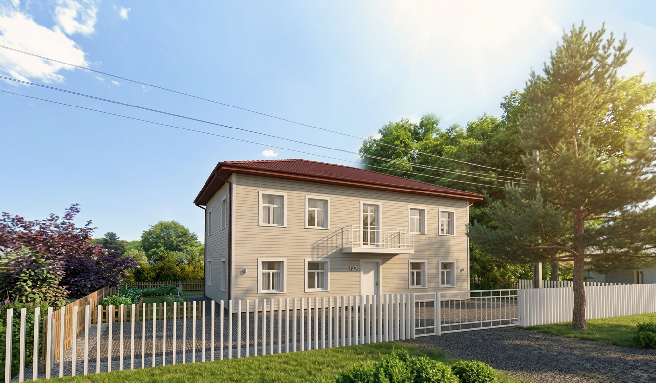 render a beautiful realistic two story house with light beige wood boards and a rich reddish brown roof the surroundings include vibrant green trees and bushes the sky is bright and clear with a few white clouds and the atmosphere is warm sunny and inviting the fence is sleek and white enclosing a pathway of dark gray gravel next to lush green grass add soft sunlight filtering through the trees for a warm and serene ambiance