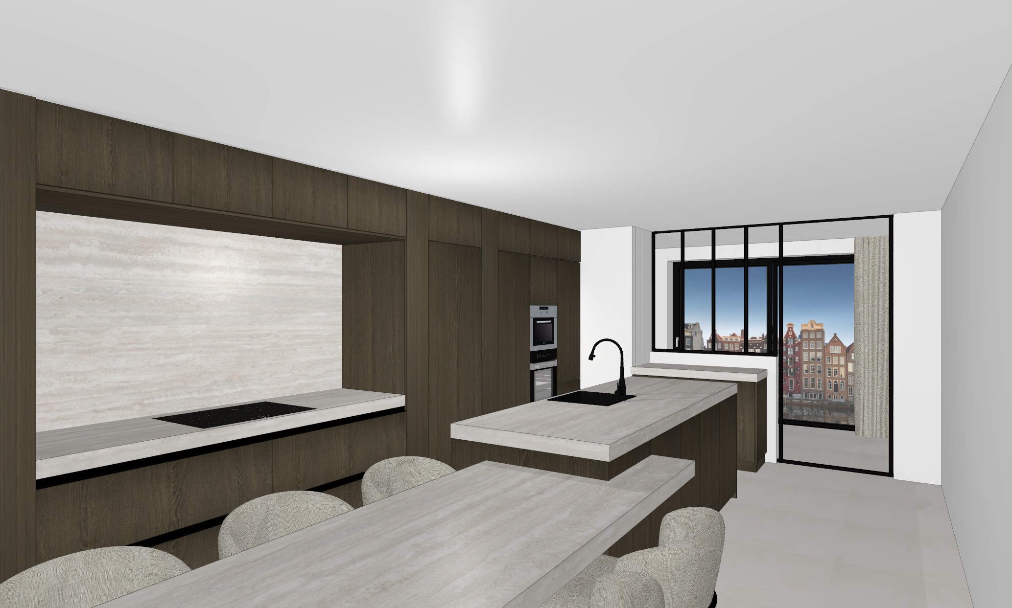 minimal modern japandi kitchen with dark brown oak doors and a travertine thick worktop and table