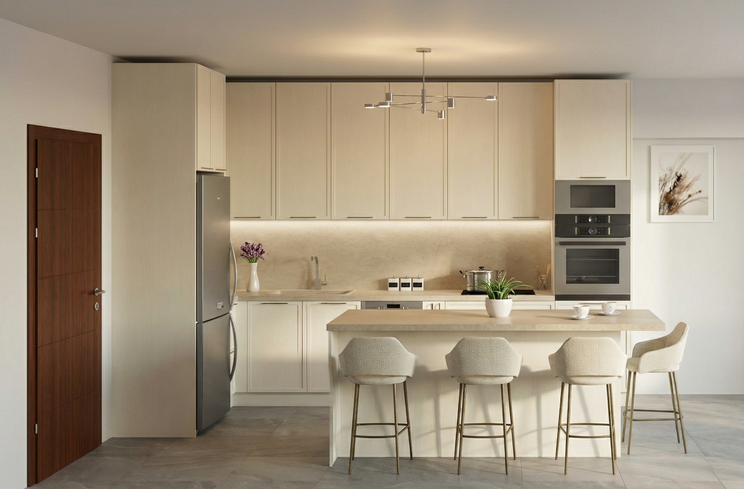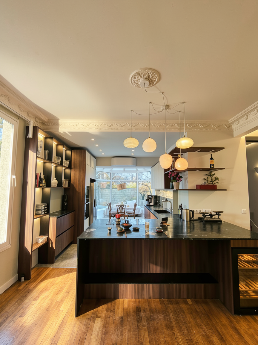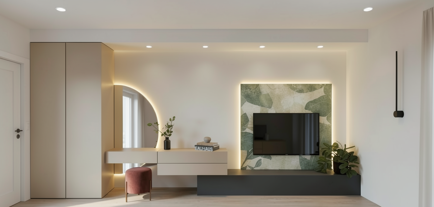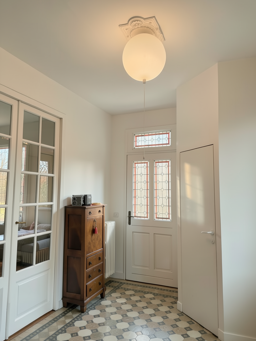 render a cozy hall with a large wardrobe made from light walnut wood adding warmth to the atmosphere against a textured beige wall soft natural light framed in rich chestnut wood the ceiling is white the floor is a light oak for a fresh look the overall atmosphere is serene and inviting with a balanced mix of earthy and neutral tones enhance with soft shadows and a gentle calming illumination japandi style the blact rectanle on the wardrobe is a mirror