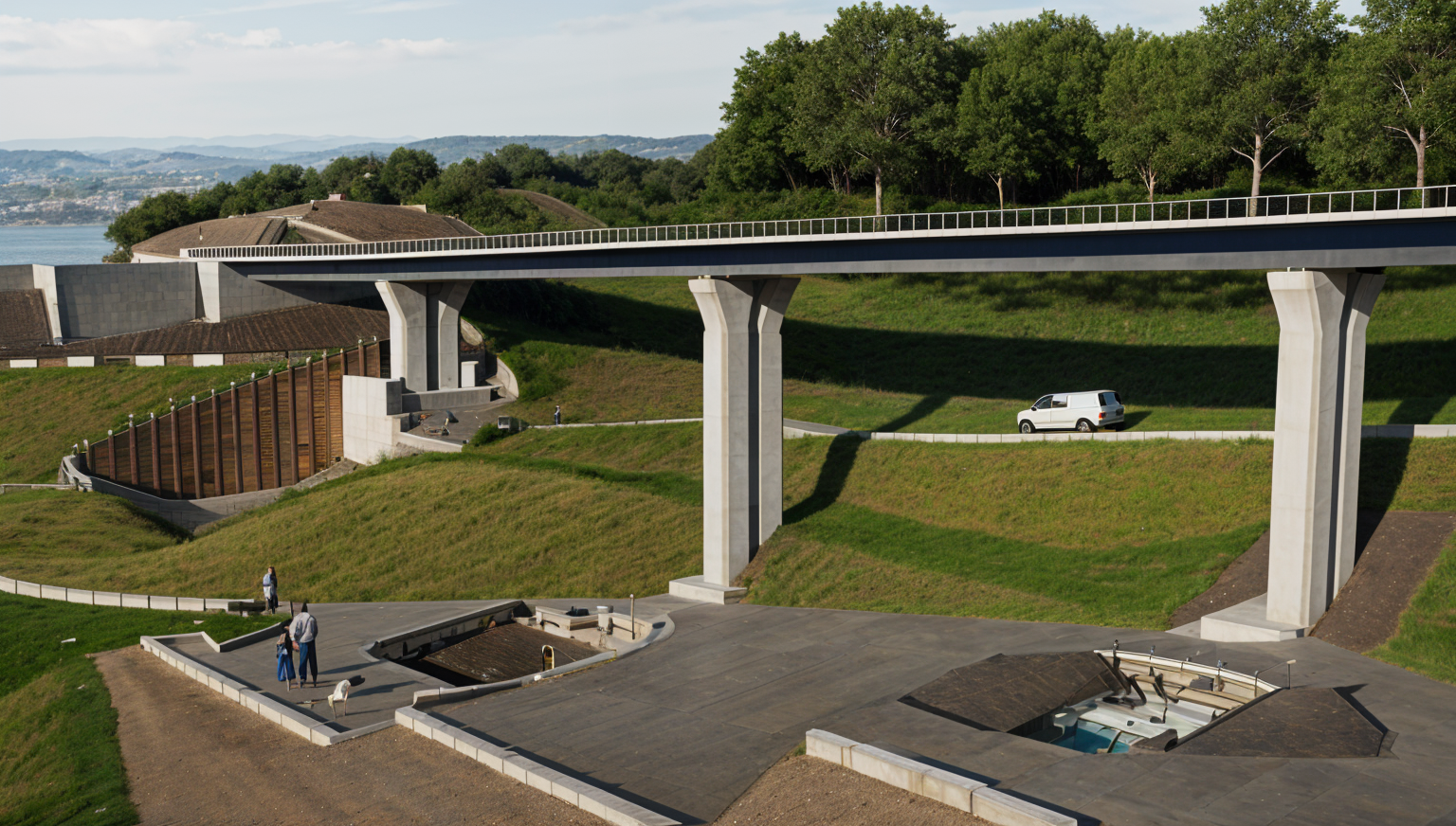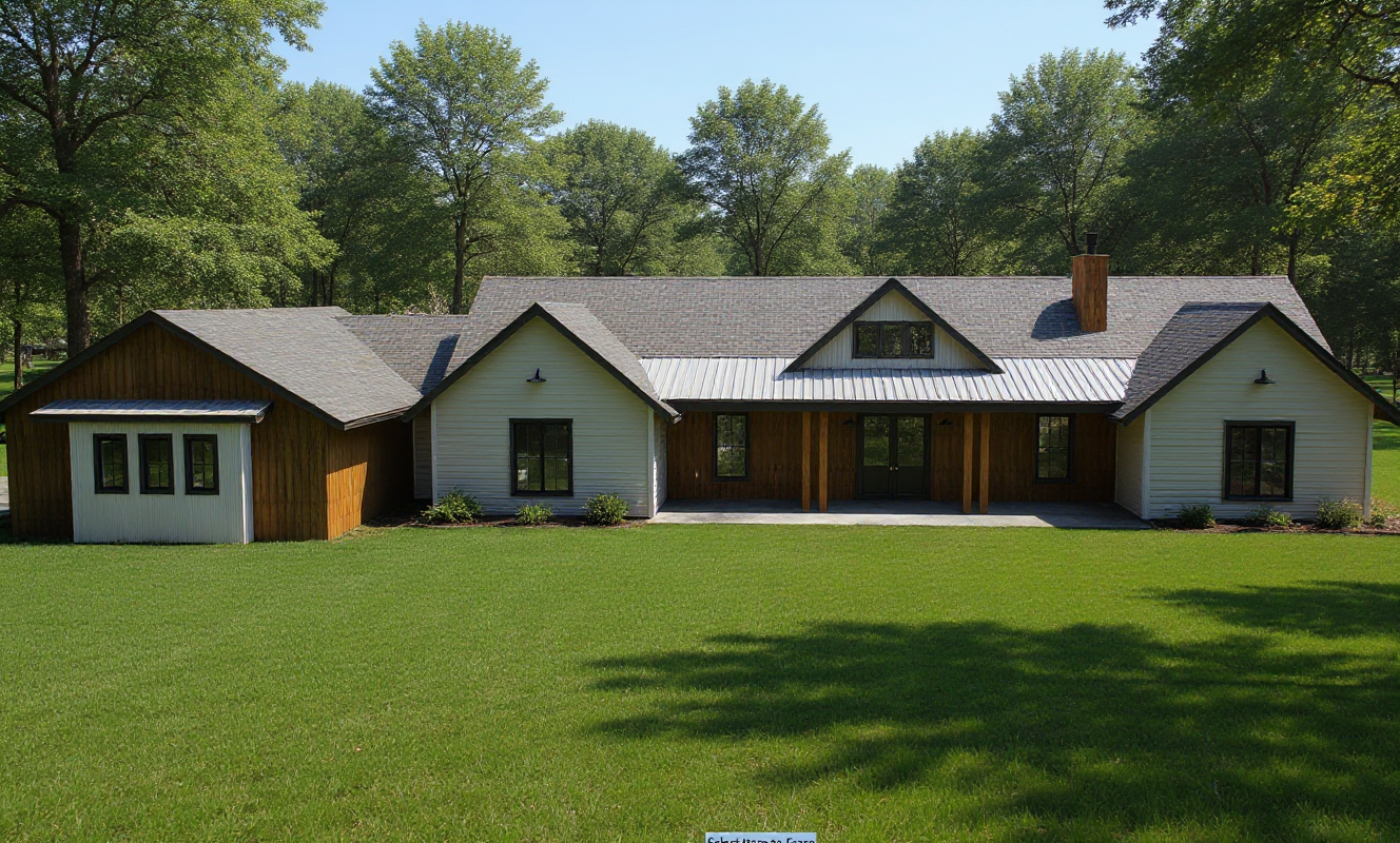 this is a funeral home in kansas mid century modern architecture with strong influences of googie futurist design and some ecclesiastical modern traits add a driveway under front porch make clean cut landscaping common to kansas wall material should be limestone concrete
