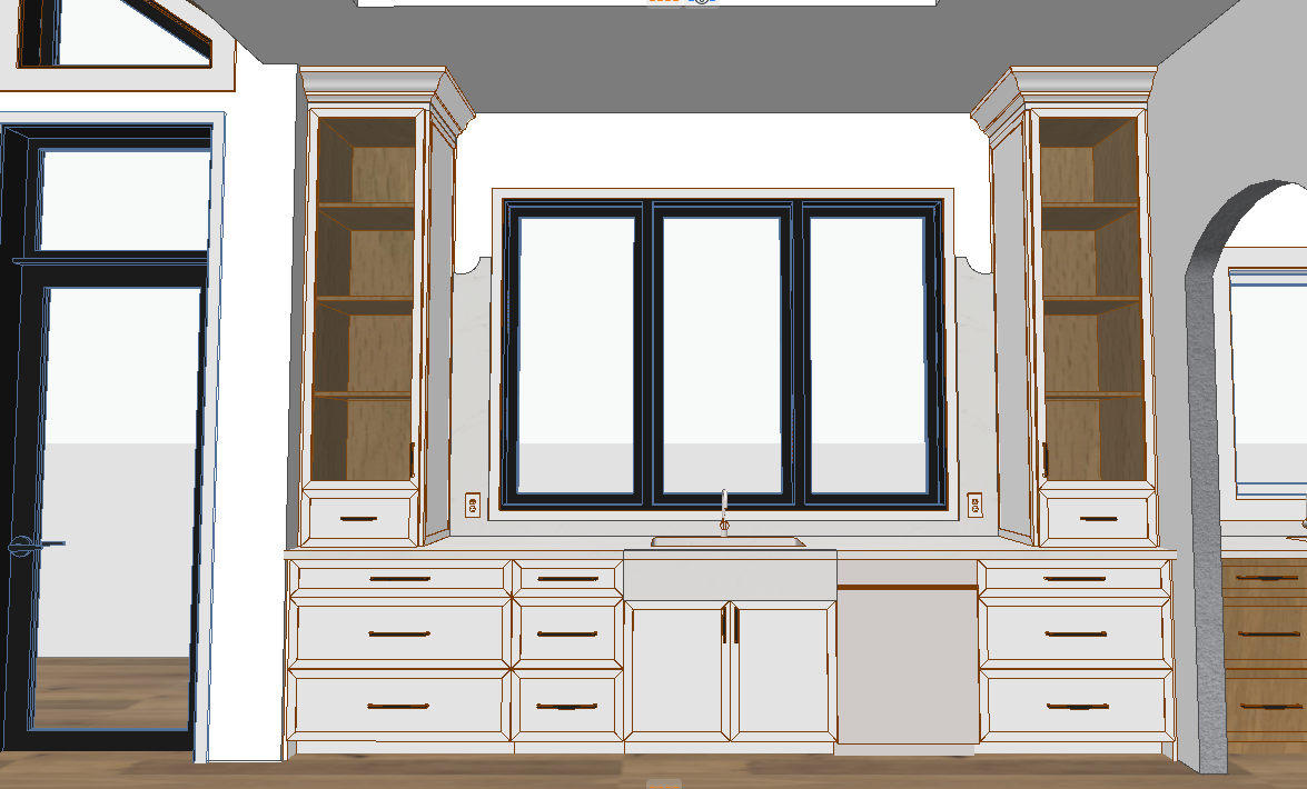 a modern contemporary kitchen design with a warm wood oak flooring complements a alabaster white cabinet including the towers warm marble countertops including the kitchen backsplash and apron sink and a cabinet with matte black handles with black window trim that overlook expansive farm land warm soft wood accents illuminate inside the cabinet tower stainless steel fittings completes the design the atmosphere is calm and relaxing atmosphere white marble countertops creating a relaxing spa like atmosphere