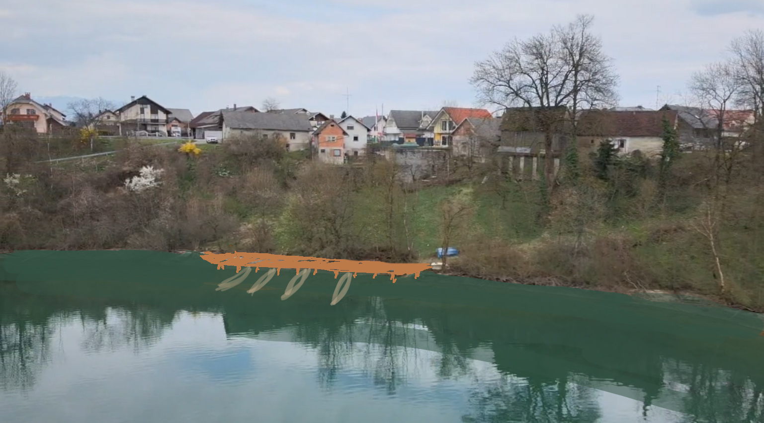 crate visualisation of the sketched parts of the image keep the viewpoint and terrain as it is in light brown color is drawn wooden footbridge along the riverside just above the water the position and length of the footbrigdge is marked on the picture with red lines there are some small boats in front of it add some people on the footbridge
