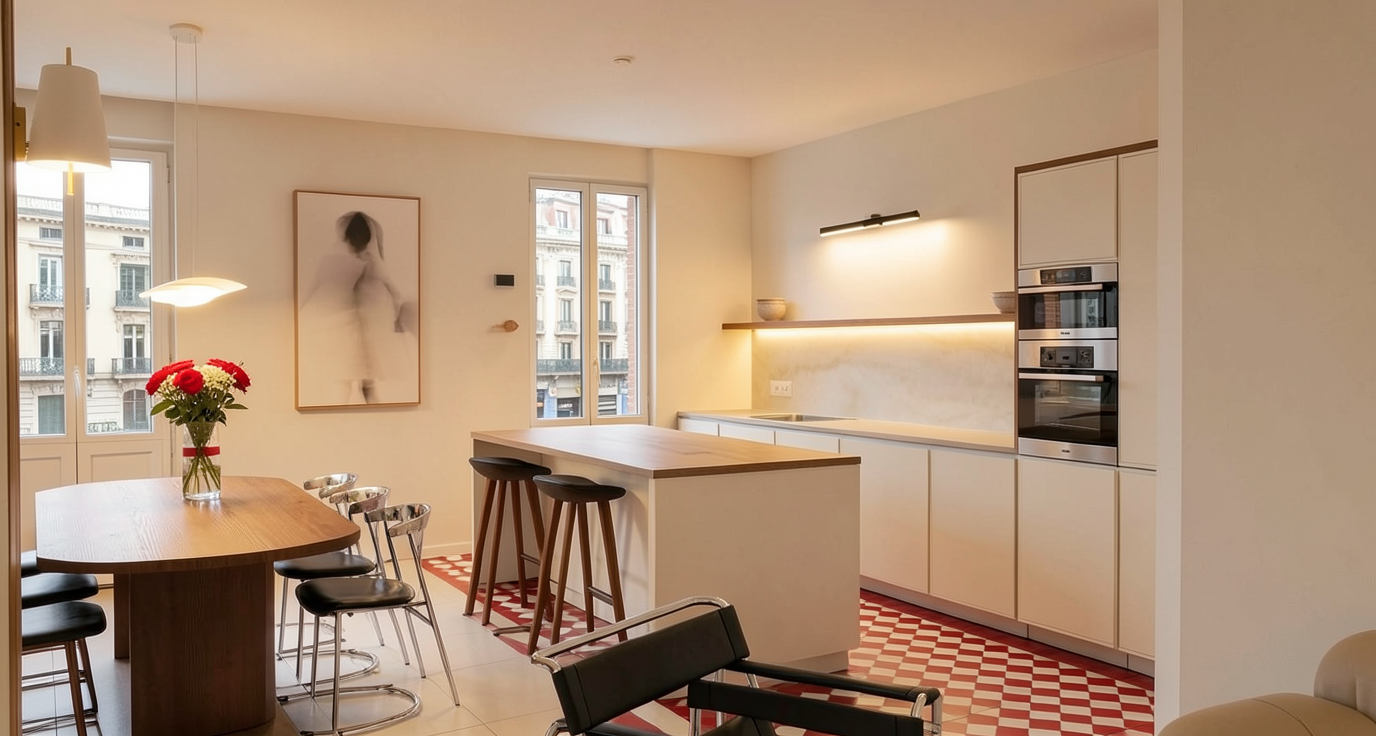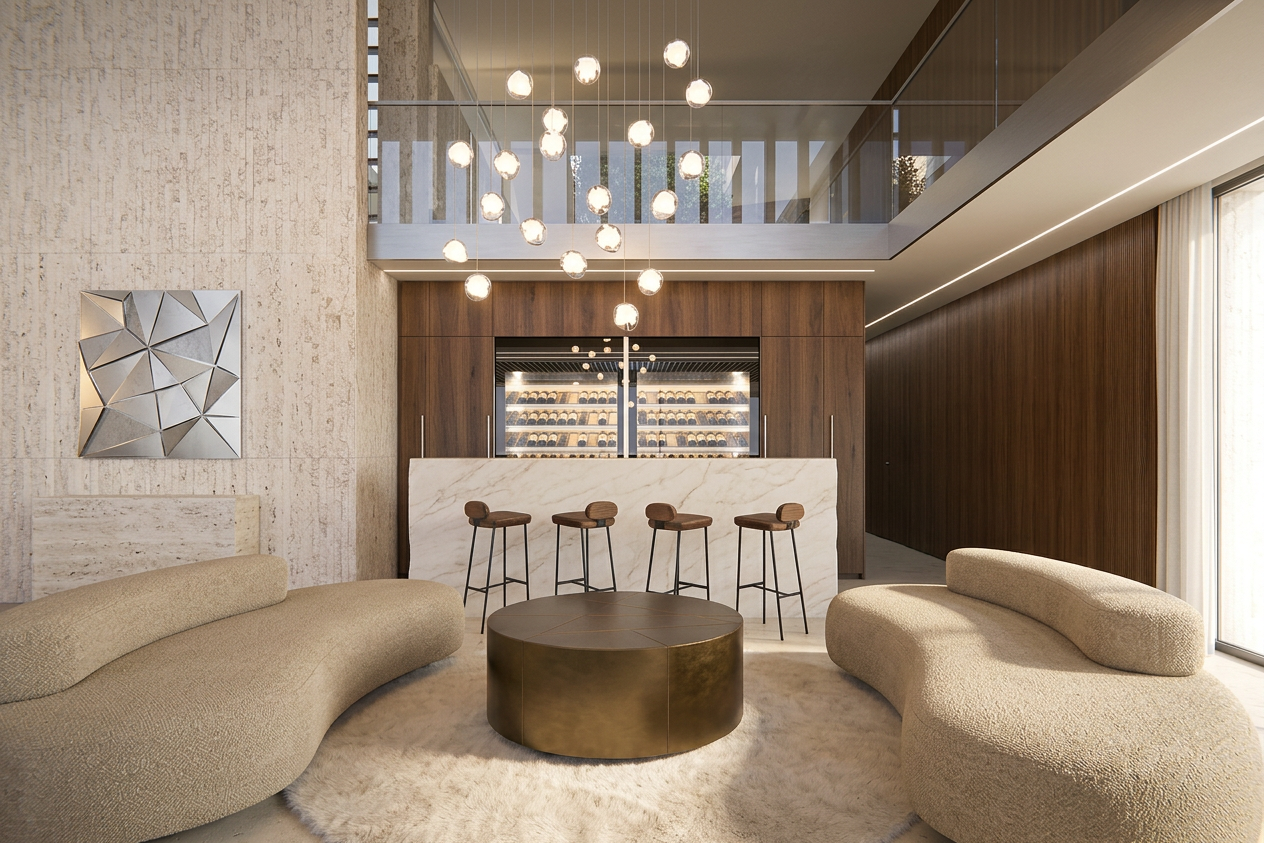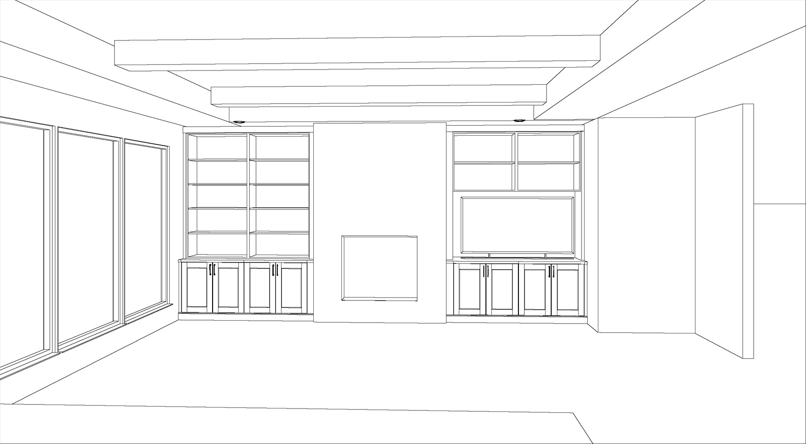 render a modern sophisticated living room interior with large windows on the left allowing warm natural sunlight to flood the space use a soft ivory color for the walls and ceiling creating an open and airy feel highlight the beams with same wood finish as cabinetry to add depth the built in shelves and cabinetry should be in a rich walnut wood providing a sense of elegance and warmth the floors are a light white oak reflecting the light and adding a cozy touch incorporate ambient lighting with soft warm tones to create a serene and inviting atmosphere there is a fireplace with mantle in the middle bump out between the built ins a large tv on the right fills the space the fireplace is surrounded with a light grey stone