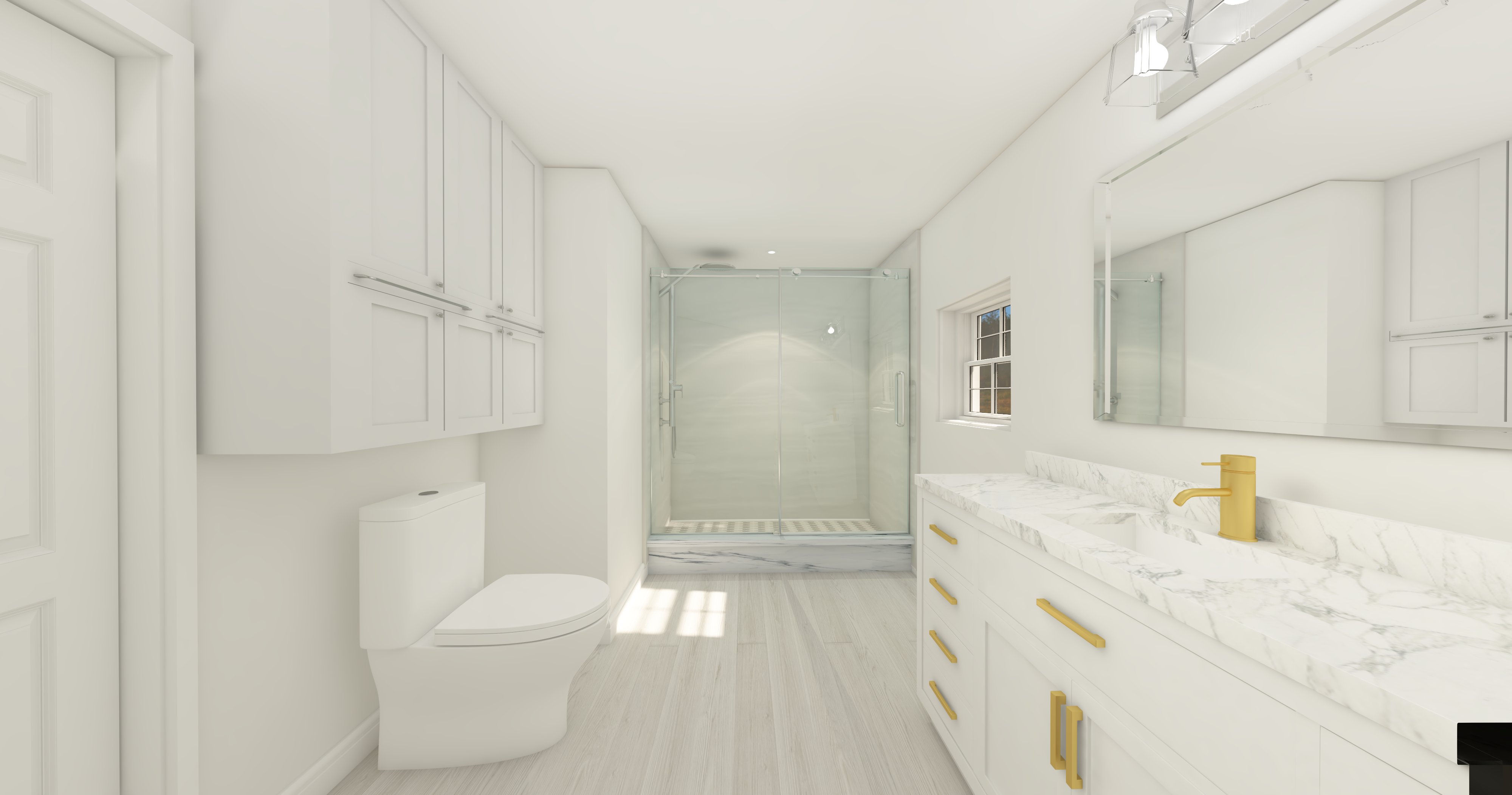 make shower floor blue and gray hexagon small put a niche in middle of shower wall with the small blue and grey hex tile turn all of the faucets and cabinet hardware brushed nickel and make the vanity cabinet and cabinet behind toilet a nice gray color