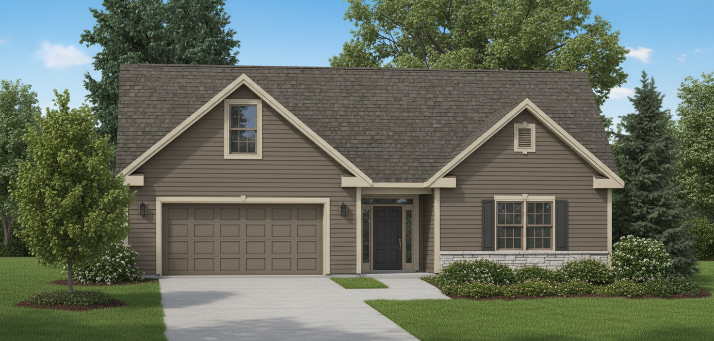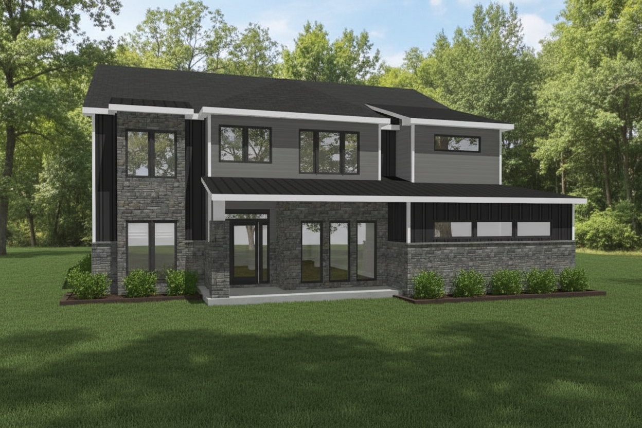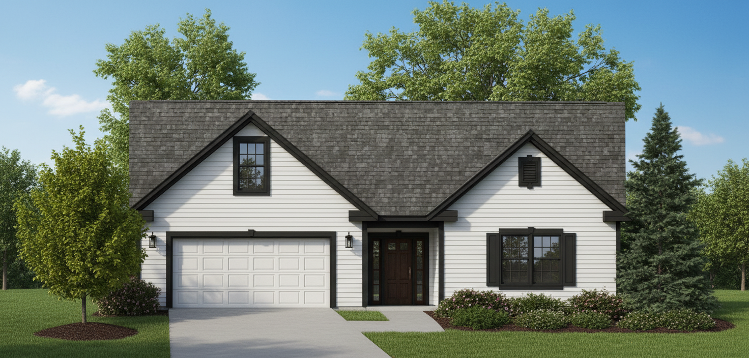 bronze siding with light trim black front door