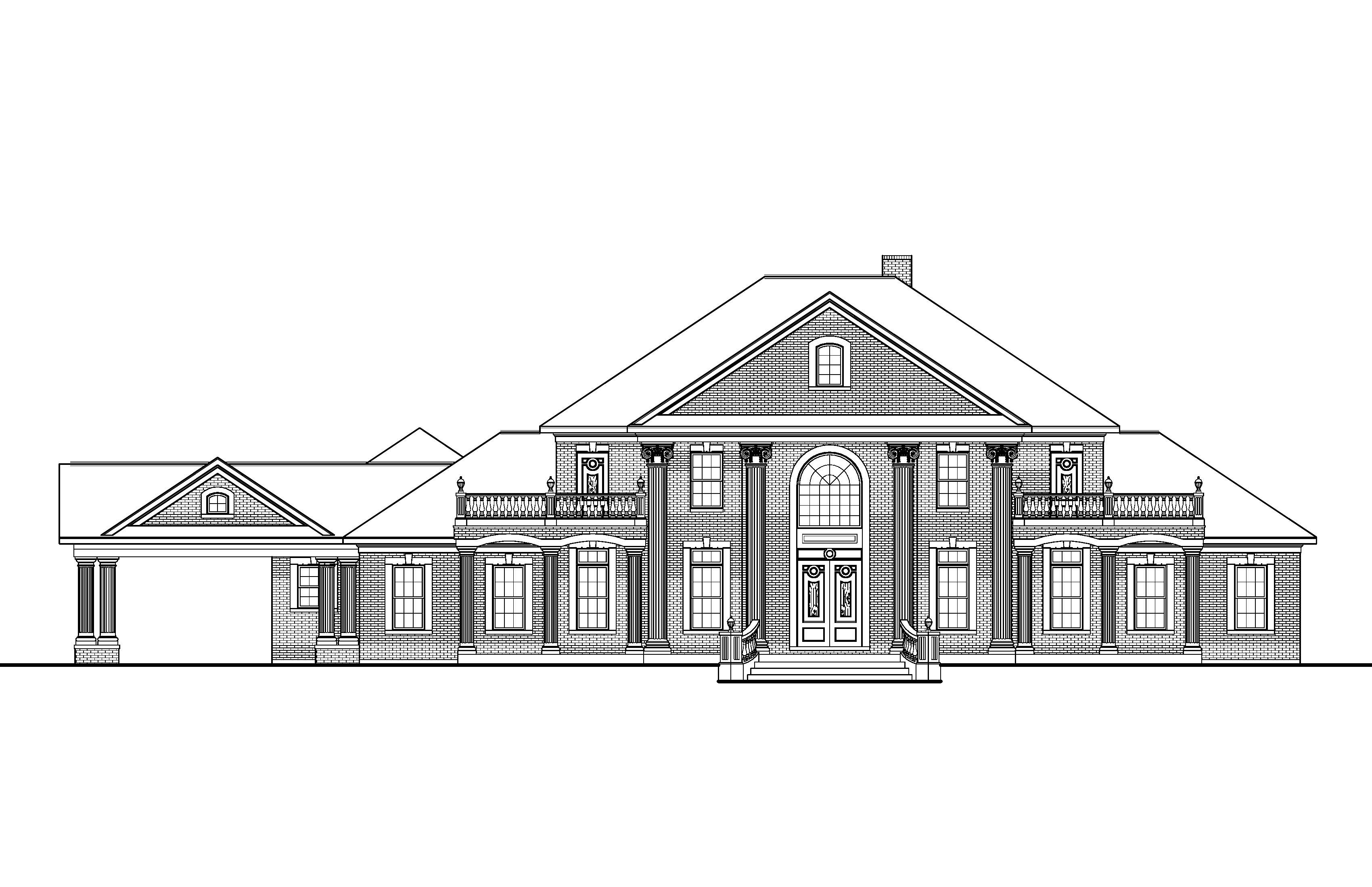 create a photo realistic perspective of the above building with traditional red brick with white windows and trim with a black shingle roof with lots of vegetation in the foreground in a suburban setting with a sunset feel