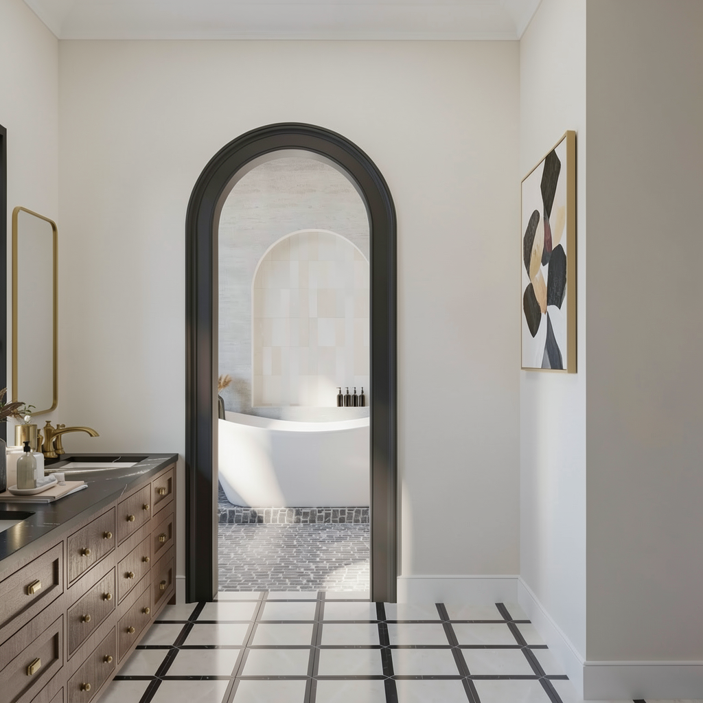 made the shower arch niche with black fluting marble tile