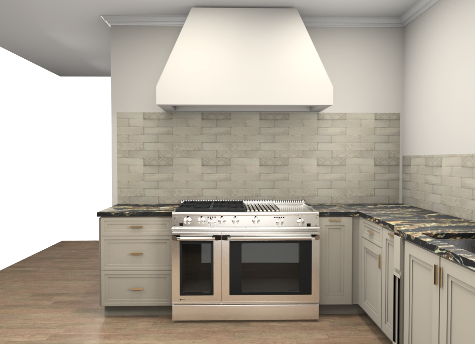 create a hyper realistic image from this kitchen rendering cabinets are accessible beige with a white oak island add floating shelves on the right hand wall transitional modern style natural light with sunlight
