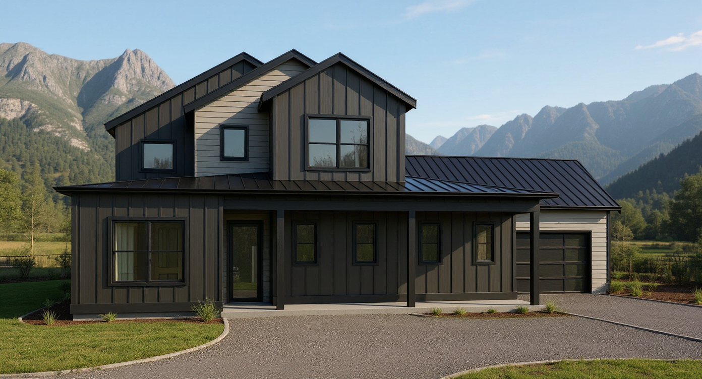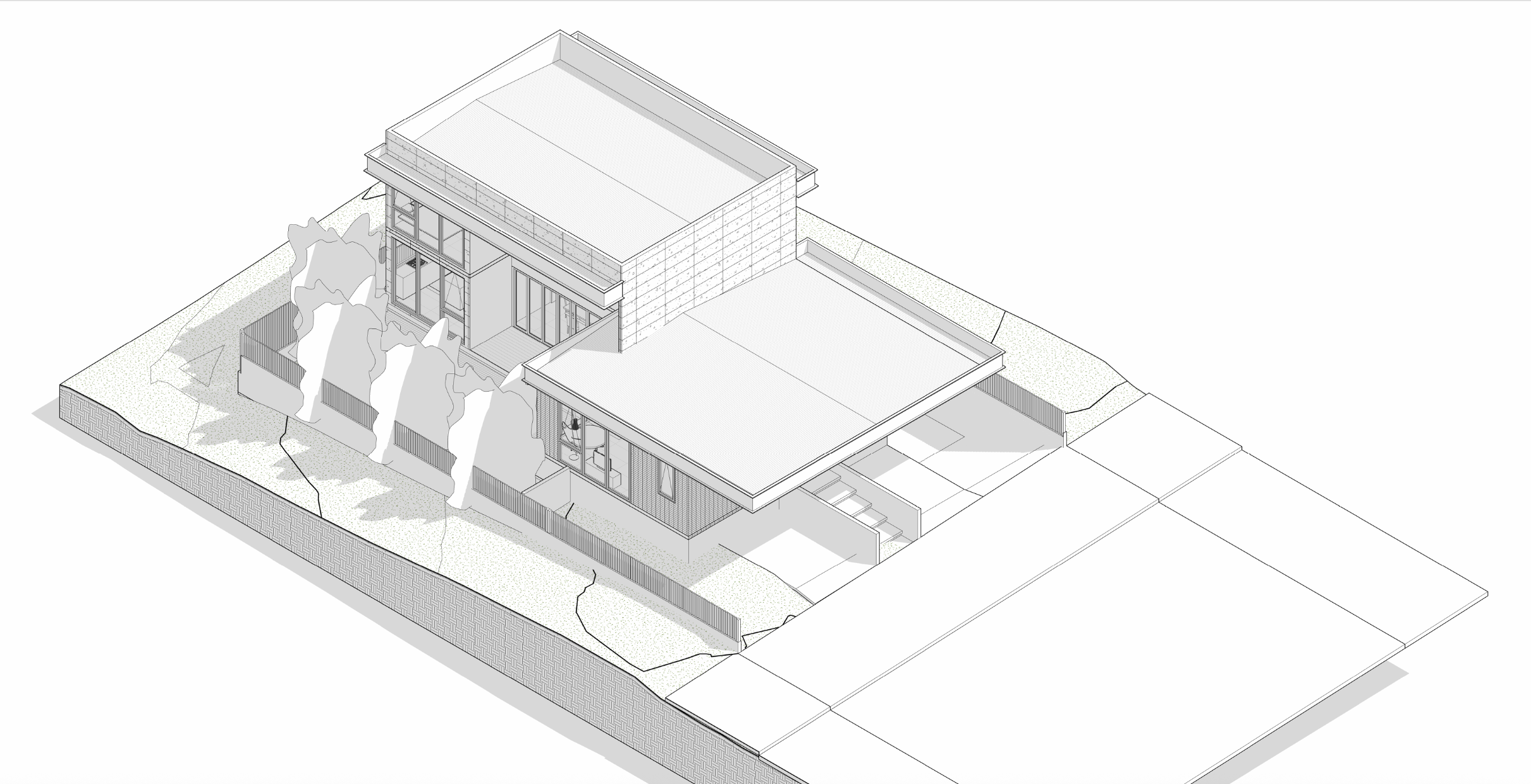 modernist exterior shot render this in photo realistic brutalist but tropicalized style architecture