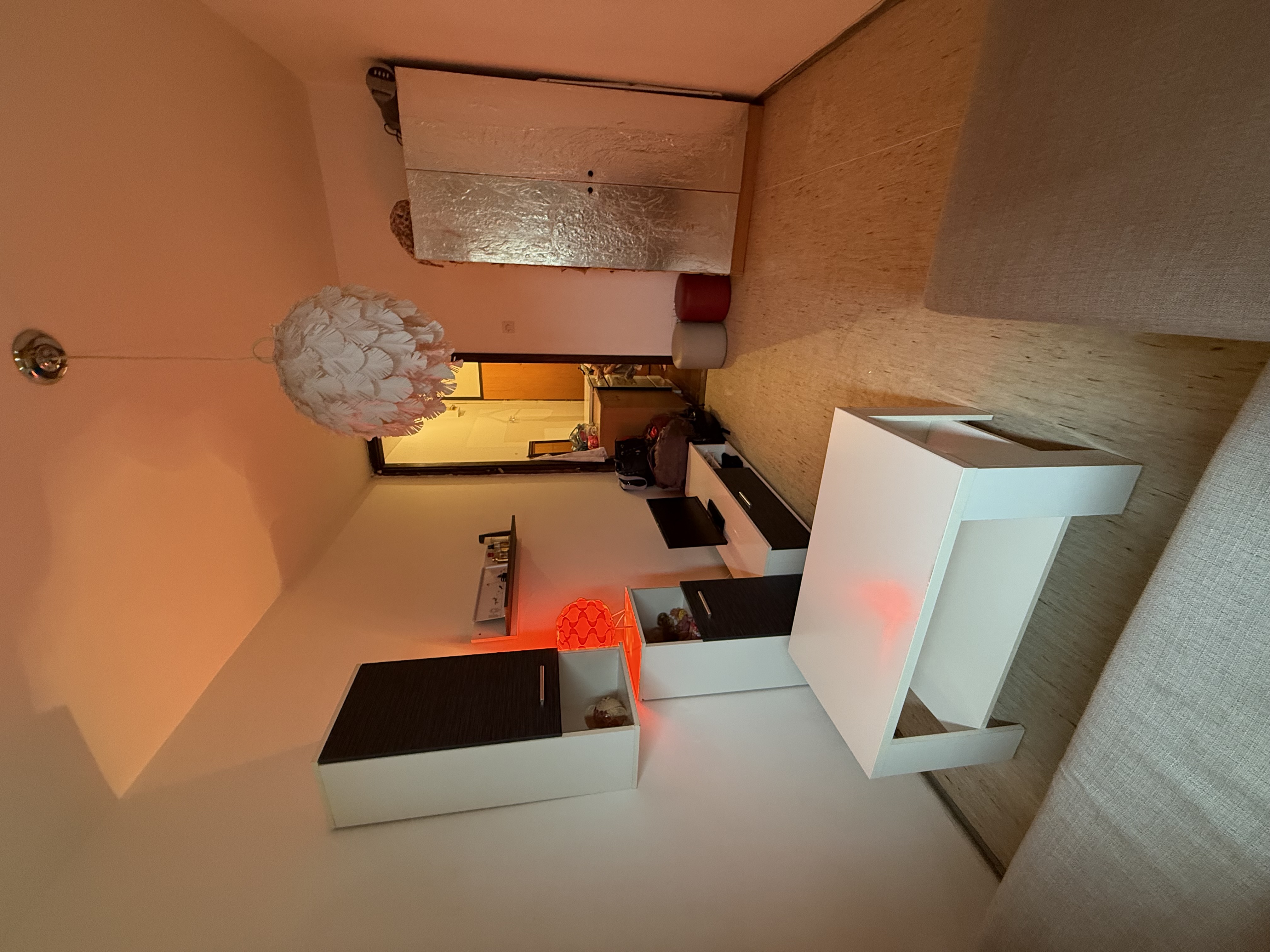 make everything in microcement including the floor walls and ceiling create a platform for a mattress for a double bed equip the space below as a living room also create a place for storing clothes