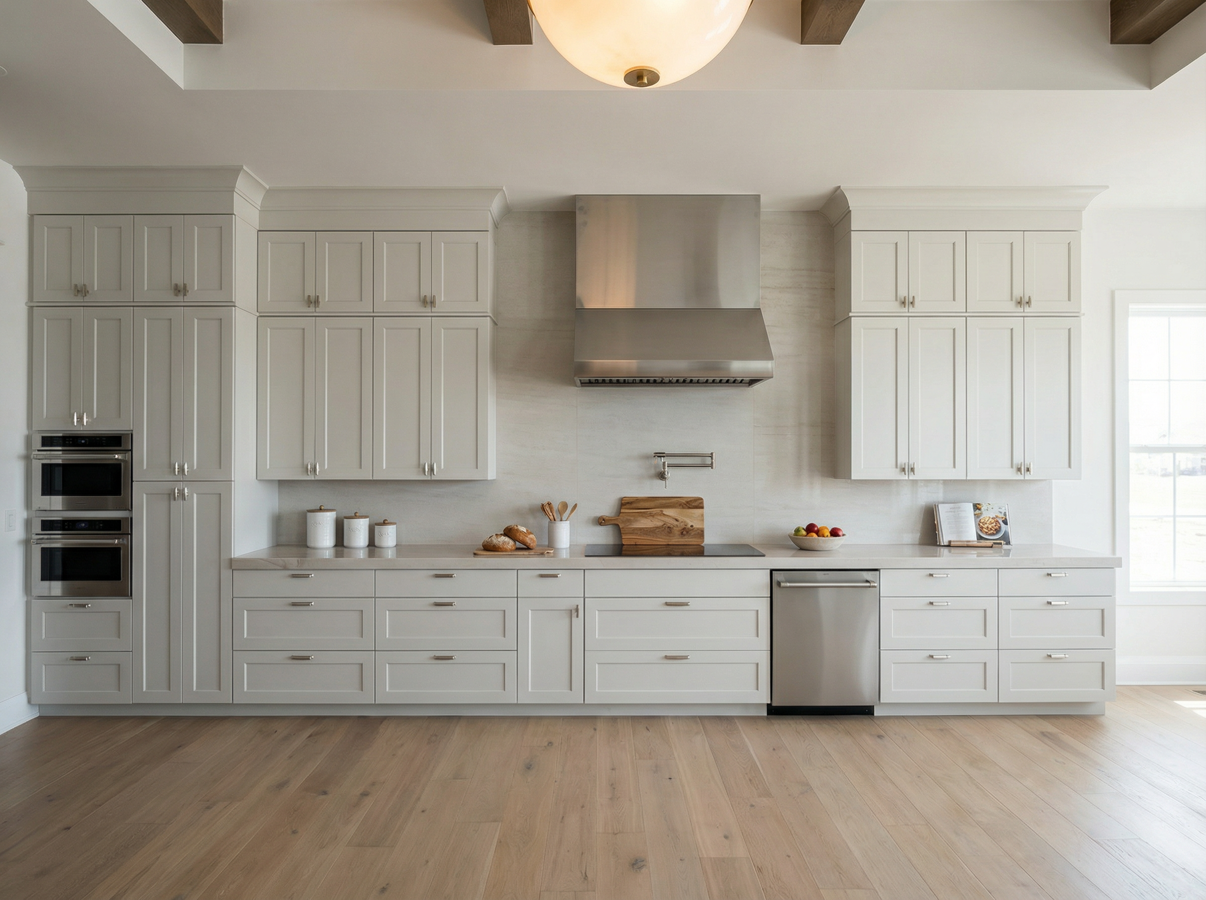 do not change the cabinets in any way preserve the exact cabinet colors materials finishes dimensions door and drawer styles hardware spacing alignment and all geometry exactly as shown do not alter the countertop shape backsplash appliances flooring lighting fixtures or wall structure only remove the construction materials clutter and mess from the scene clean the room and make it look finished and staged add a few simple tasteful home accessories appropriate for the style of the space but do not add or remove any furniture windows or architectural elements maintain the original lighting direction and realism enhance clarity and polish the photo while keeping the cabinetry and room design completely unchanged do not alter the lighting to keep the cabinet colors as they are in the image add a stainless hood between the upper cabinets remove the white tape on all of the cabinets add brushed nickel pulls to all of the cabinets do not change the cabinet color at all