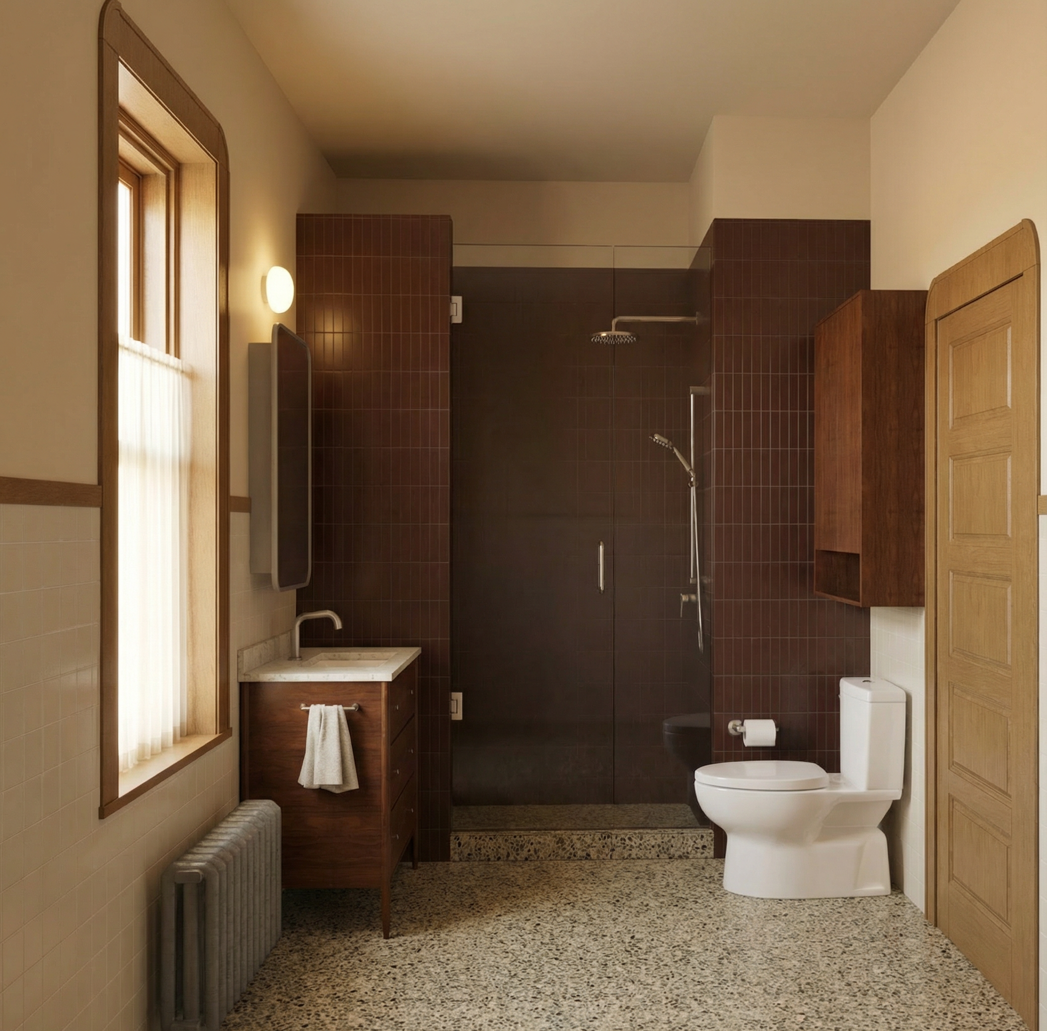 render using exact massing contemporary farmhouse with white siding stone foundation metal roof wooded setting with diffused light
