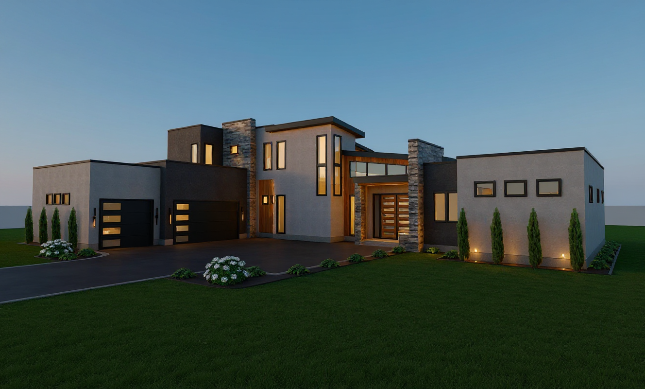 modern luxury house sleek and elegant design use a light gray stucco exterior with some portions a darker gray stucco with soft gray stone accents incorporate black window frames and a black metal roof and soffits add warm wooden elements with a natural cedar finish for the doors and decorative panels the driveway should have a smooth black asphalt texture surround the house with vibrant green grass well manicured and lush add small bushes with white flowers and tall slender dark green juniper skyrocket trees for landscaping set the scene under a blue sky with the sun fully lighting all parts of the building evoking a luxurious and family friendly atmosphere keep ambient lighting high