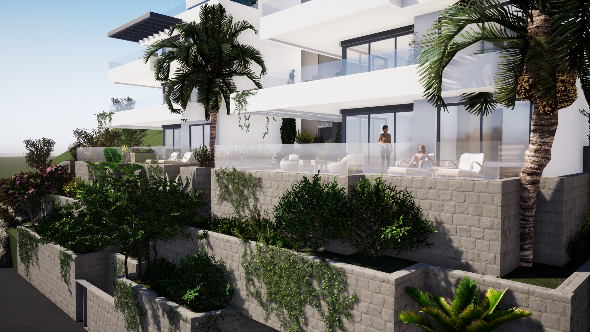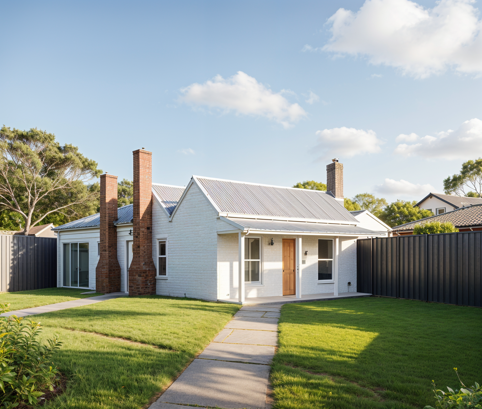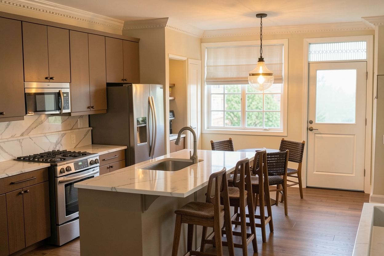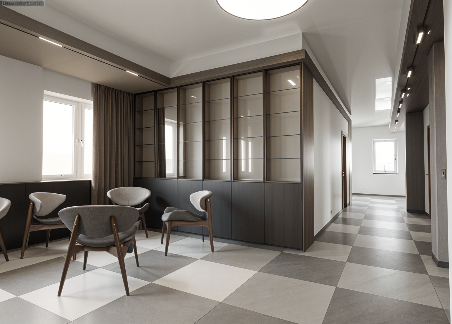 render a modern elegant living room with a cozy and warm atmosphere feature a cream colored curved sofa on the right with a soft texture include two light grey rounded armchairs as focal points and position a sleek round white coffee table in the center the backdrop consists of a large window nook with sheer beige curtains accentuated by bright red cushions a wall of open shelves with warm dark wood tones fills the background with soft light casting subtle artistic shadows the ceiling is adorned with exposed dark wooden beams and a sculptural minimalist floor lamp adds a contemporary touch the floor is a light tan textured tile creating a harmonious and inviting ambiance