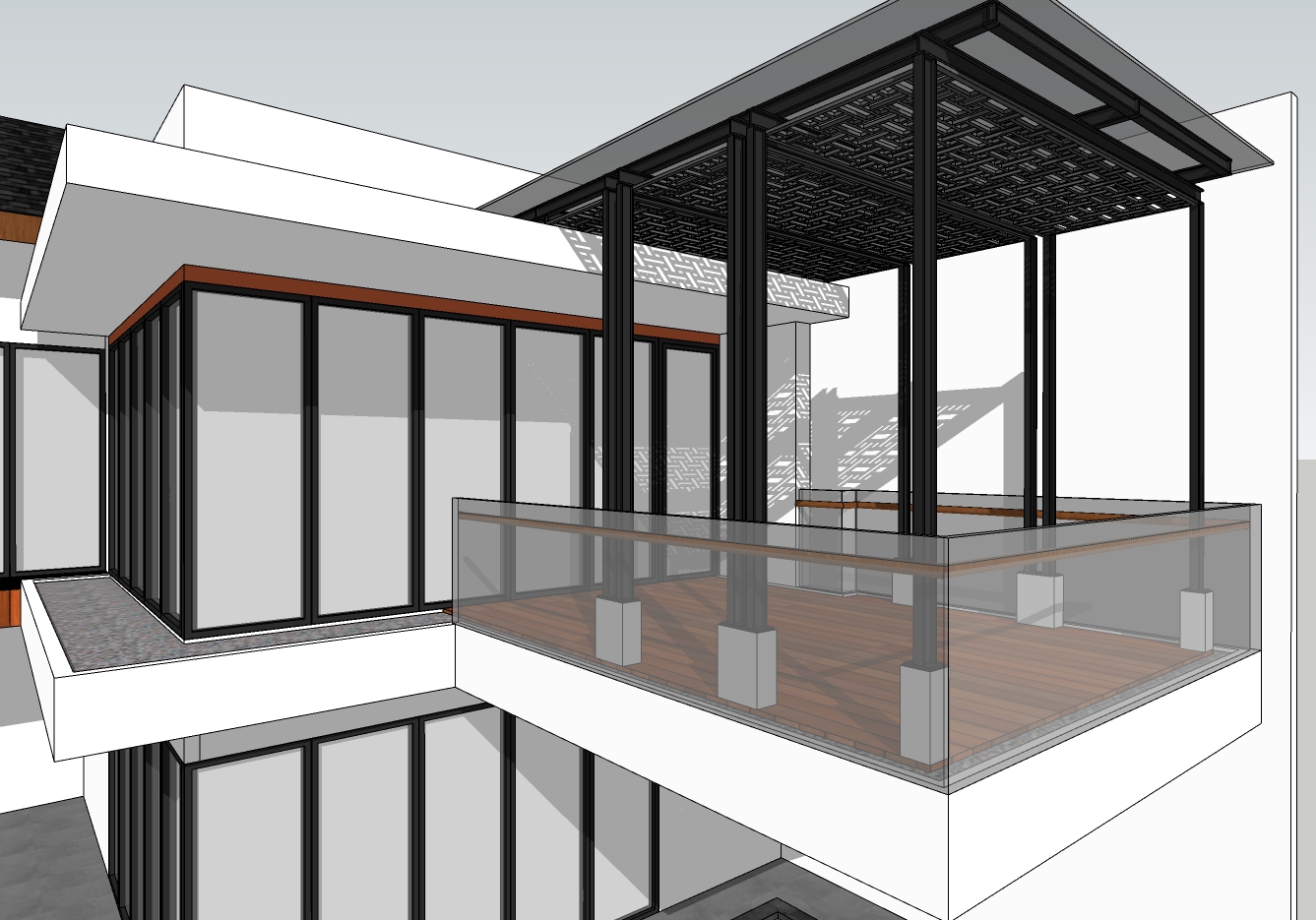 modernist perspective shot modern architectural design of a two story building with a minimalist style featuring large glass windows framed in sleek black metal the main structure is painted in a bright white color providing a clean and contemporary appearance the outdoor balcony is bordered with transparent glass railings enhancing the modern aesthetic the roof structure is stylishly patterned with a dark charcoal gray contributing to the sophisticated look the atmosphere is serene and inviting with soft diffused natural lighting casting gentle shadows across the surfaces the roof on the right is a grayish transparent canopy with gray laser cut under it not a wooden latticework the balcony using wood decking with warm tone stay true to the structure as much as possible the railing has wooden railing as the handrail for it architecture