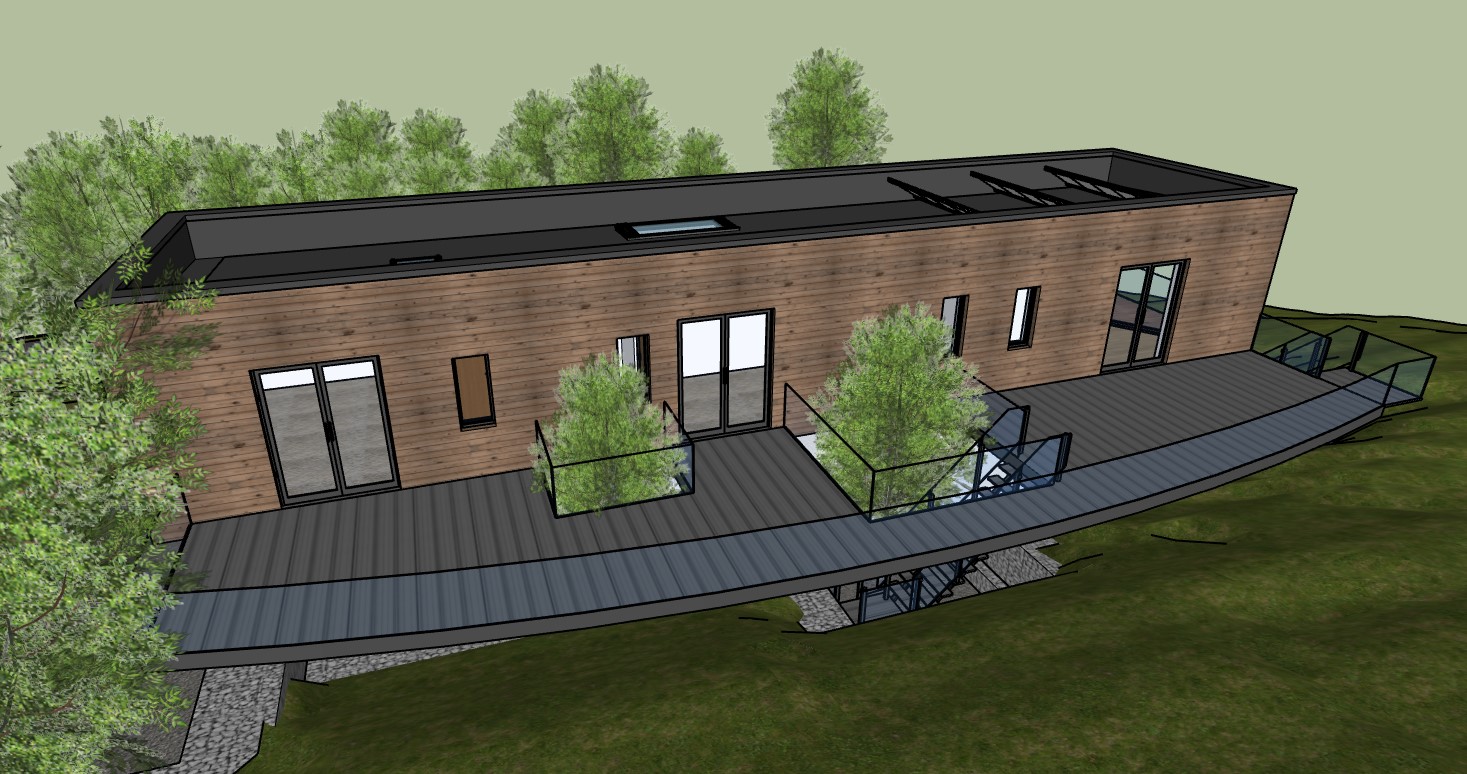 crisp white render lower walls and horizontal larch cladding upper walls larch decking