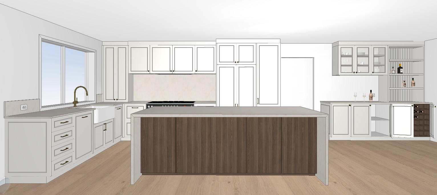 add natural light coming in through the window add kitchen decor inc a dining table on the right hand side add led lighting to the underside of the overheads and bar area shelving add 3 stools to the island and someone standing at the island bench chatting to someone sitting at the island