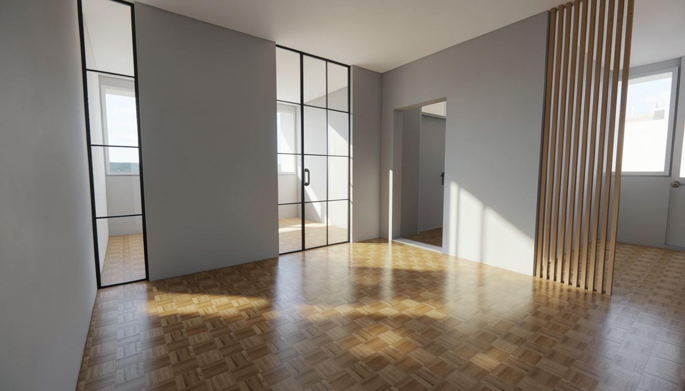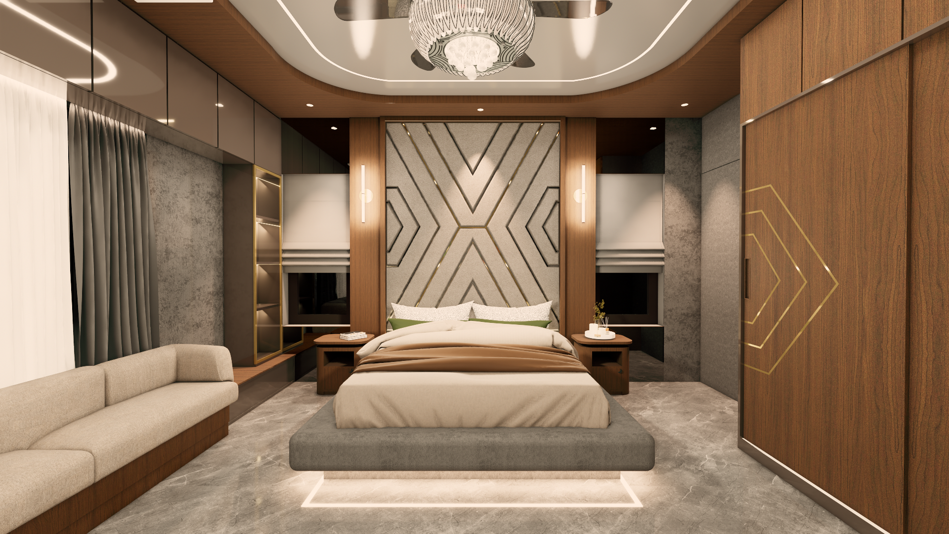 make changes in colors if required to the room with the color pallete walnut wood medium and dark grey beige and brass metal and let the room look dark but cozy and make it look realistic and also make the headboard and headboard fabric and grooves make it look realistic and leave the seater color as it is