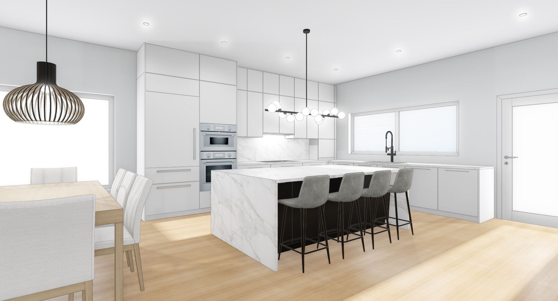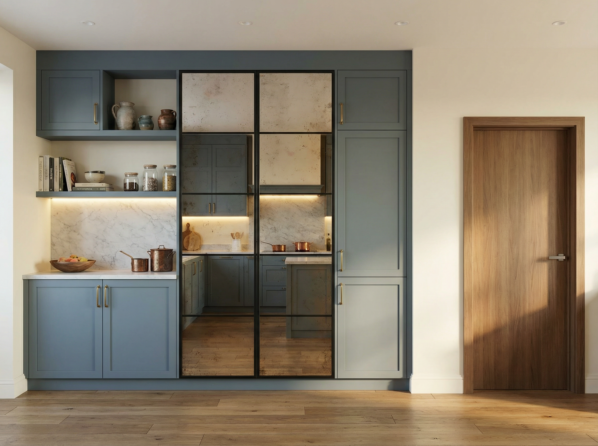 add some green plants moody light foggy cambridge ma background behind the windows do not change cabinets nor add open shelves
