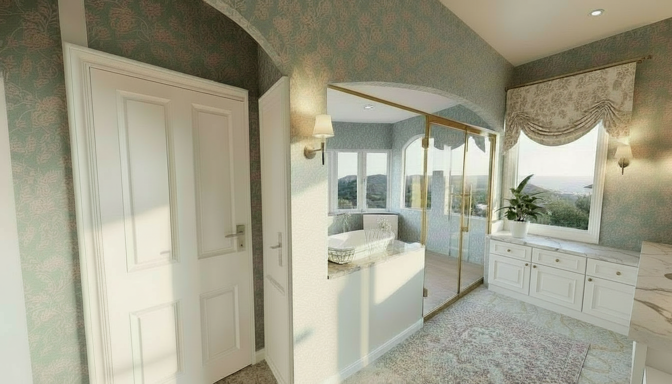 create an extremely realistic bathroom rendering with a bronze shower frame and glossy glass doors all windows should have bunched valances the window frames and cabinetry should be white antique looking sconces warm the space the floor and countertops should be white marble the blue patterned wallpaper gives the space an elegant look the view outside should be a grassy yard with trees behind