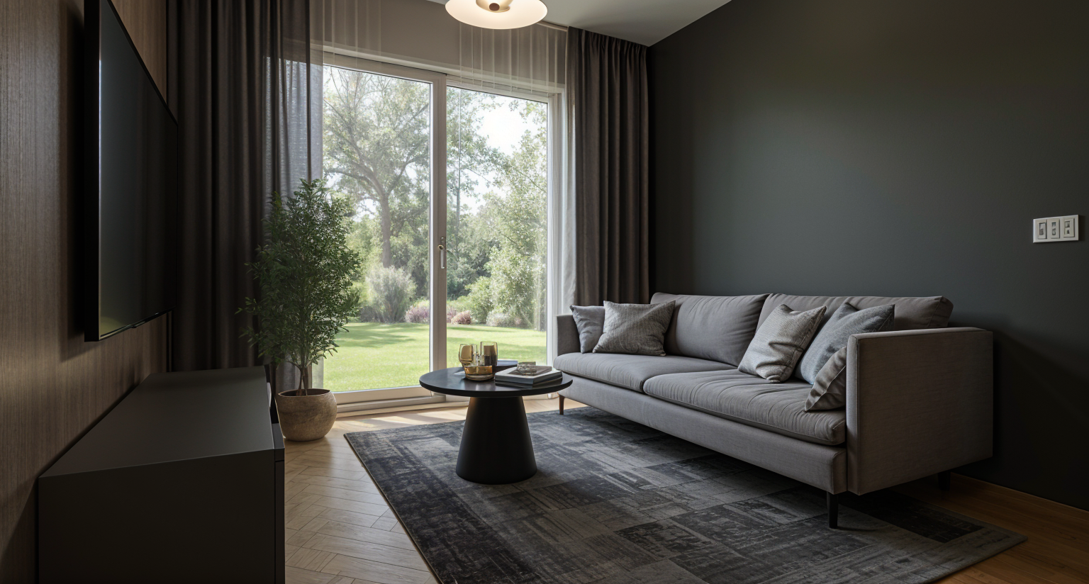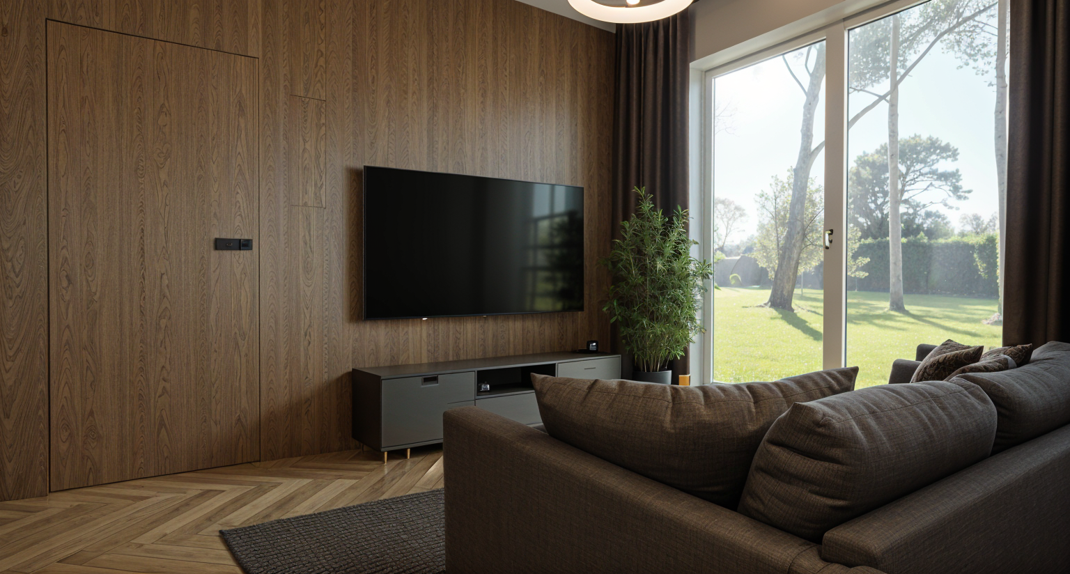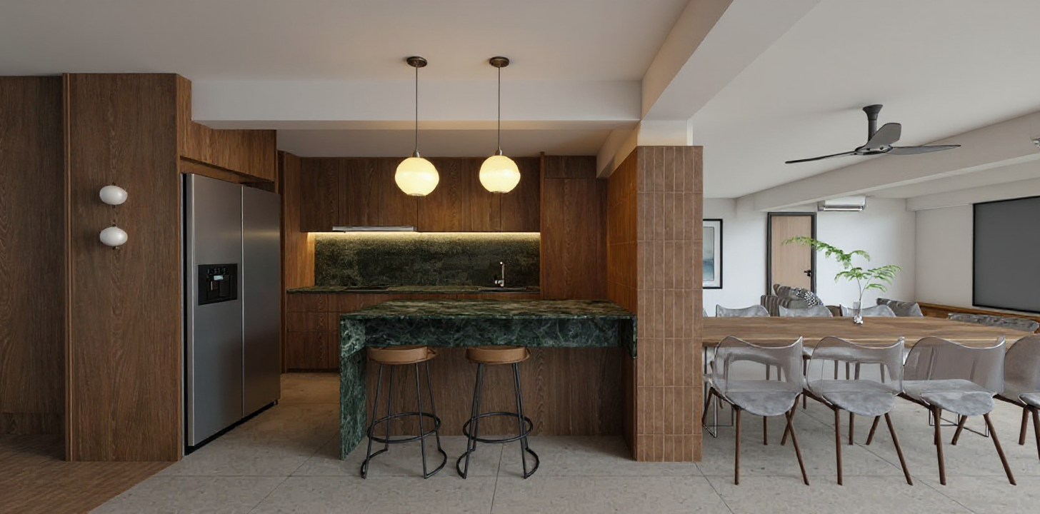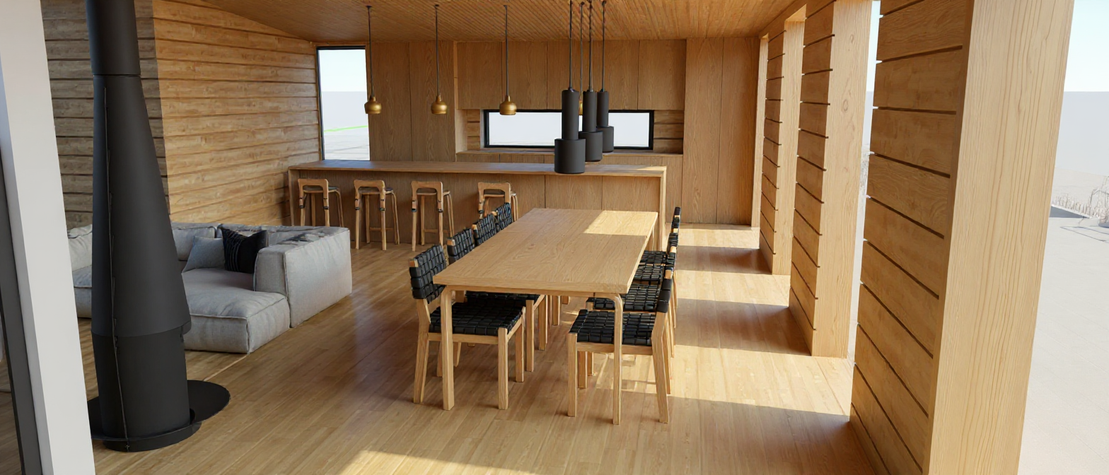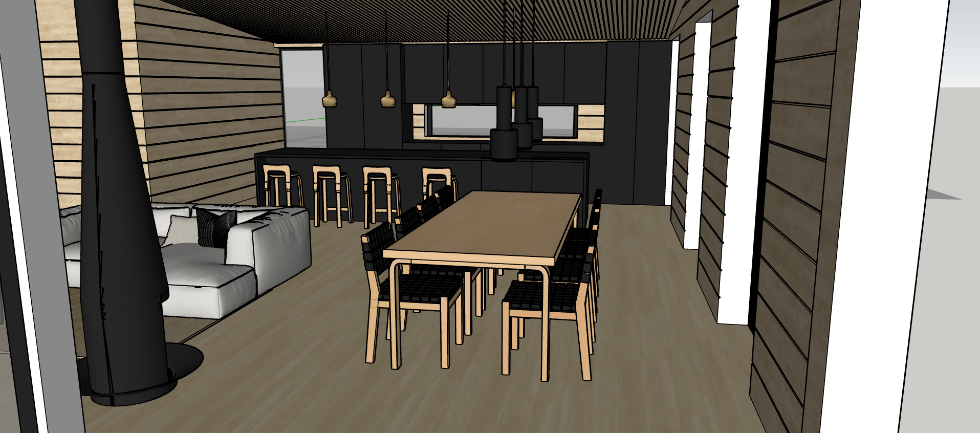 mage to image render convert this sketchup scene into a bright photorealistic scandinavian interior with light natural wood surfaces keep everything exactly the same as in the original image same camera angle and composition same door openings same dining table and woven black chairs same pendant lights same windows same fireplace and sofa same proportions layout and objects modify only materials and lighting change all walls to light natural pine light birch wood matte warm toned scandinavian finish change ceiling to matching light natural wood increase overall brightness add soft natural daylight flooding in from the large windows balanced white light soft shadows high dynamic range no new objects no styling changes style bright scandinavian natural wood interior warm minimalism ultra realistic materials soft daylight 8k clean and elegant kitchen cabinets are black