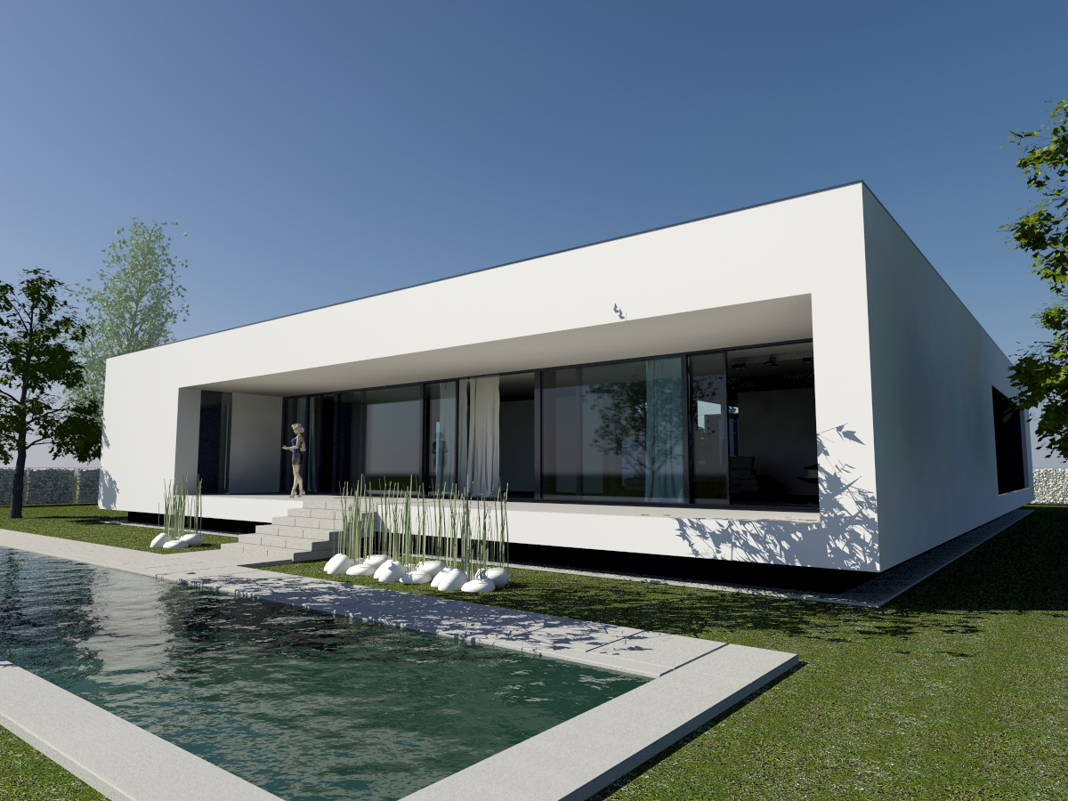 do not change the shape and volume of the building apply architectural concrete plaster in anthracite color on the facade add trees