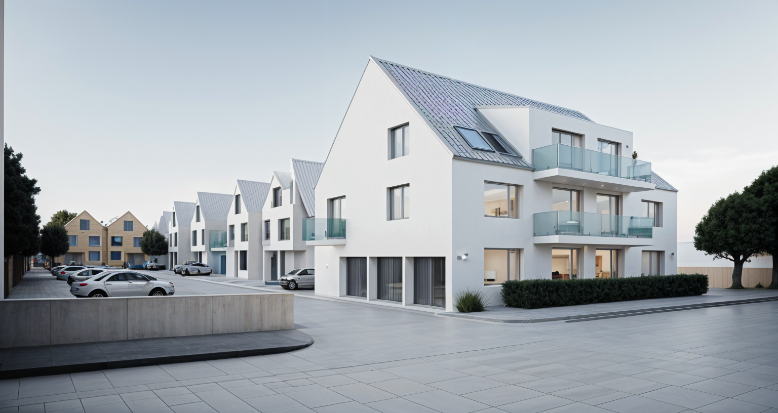 a modern two story house with a sleek design featuring large glass windows and a wooden facade the roof has a flat minimalist structure the exterior walls are a light cream stone contrasting with the warm brown wooden panels a lush green lawn surrounds the house leading to a clear reflective pool tall green plants line the stone wall in the background adding a touch of nature the sky is a serene light blue with soft wispy clouds creating a calm and inviting atmosphere