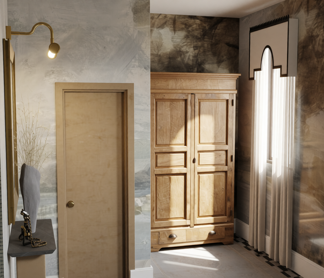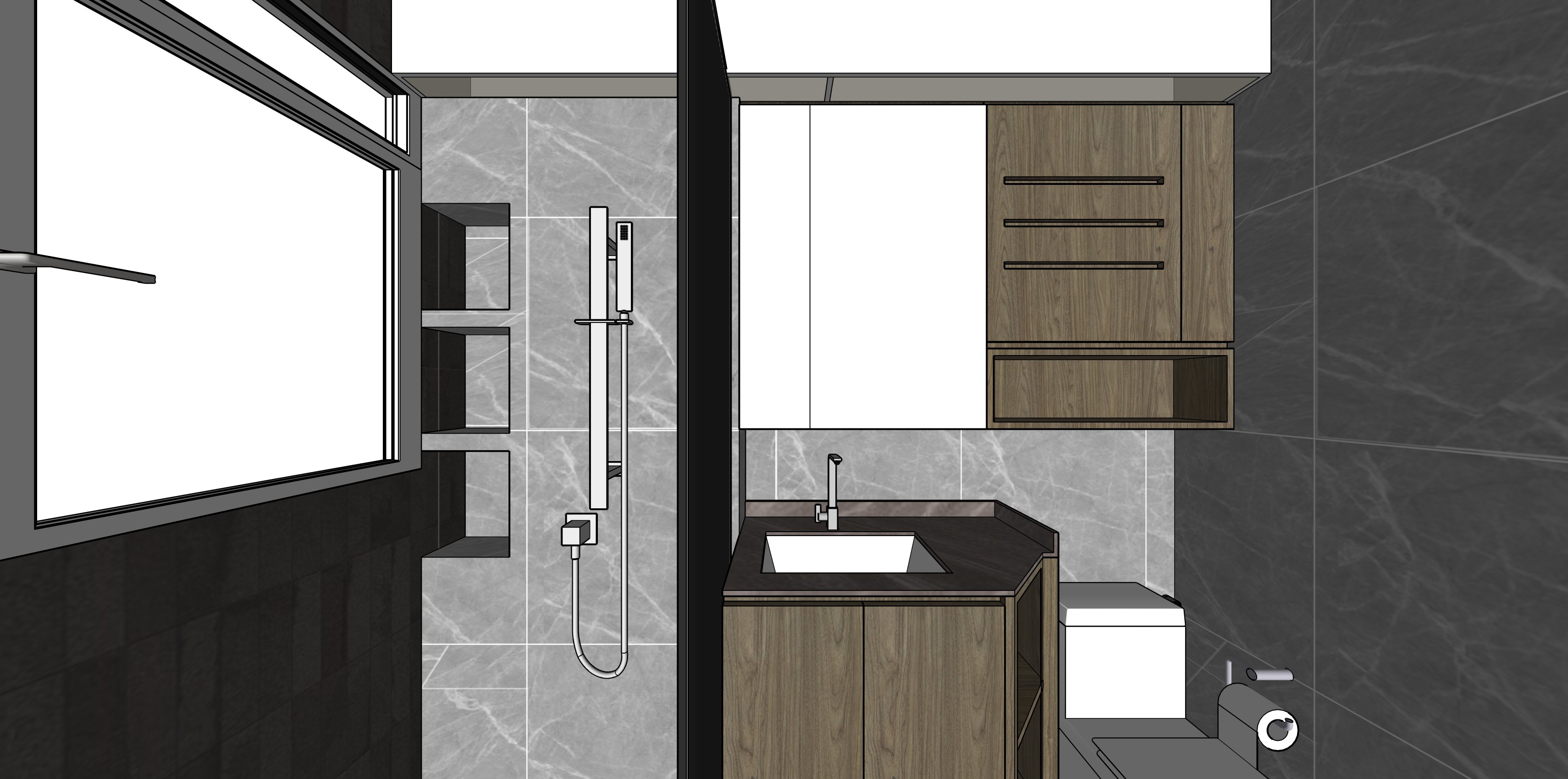 add warm led lighting to the bottom of the storage mirror also add warm led lighting to the bottom of the boxed up beam mirror to reflect part of wall and a black louvre door add a single black ceiling light display shelves with some display ornaments shower screen is black framed