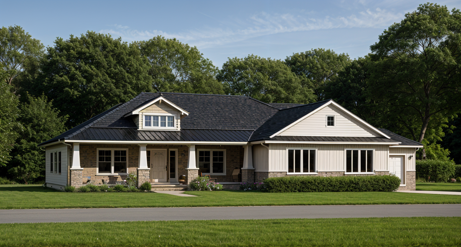perspective shot please render this brand new single family home with extensive landscaping using the photorealistic 3d style with the following instructions season is summer home is surrounded by trees in sunny daylight white vinyl windows trim and garage door no structural changes all windows gables stone elements shapes sizes and placements should match the original 2d sketch exactly preserve door and window locations this is a visual style request only please do not alter the layout in any way