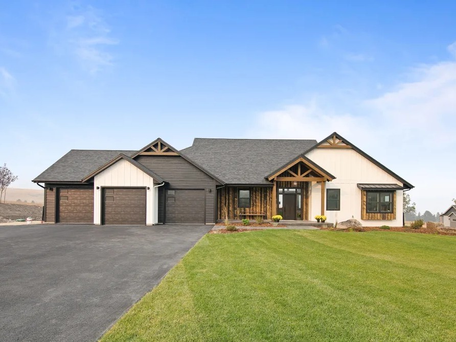 grainy watercolor render of building keeping the lap siding and board and batten give it a mountain modern style watercolor trees and hills in the background extensive watercolor landscaping surrounding the building with small washed rock gravel and grass a little more clay illustrative look