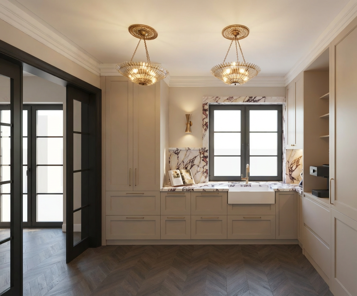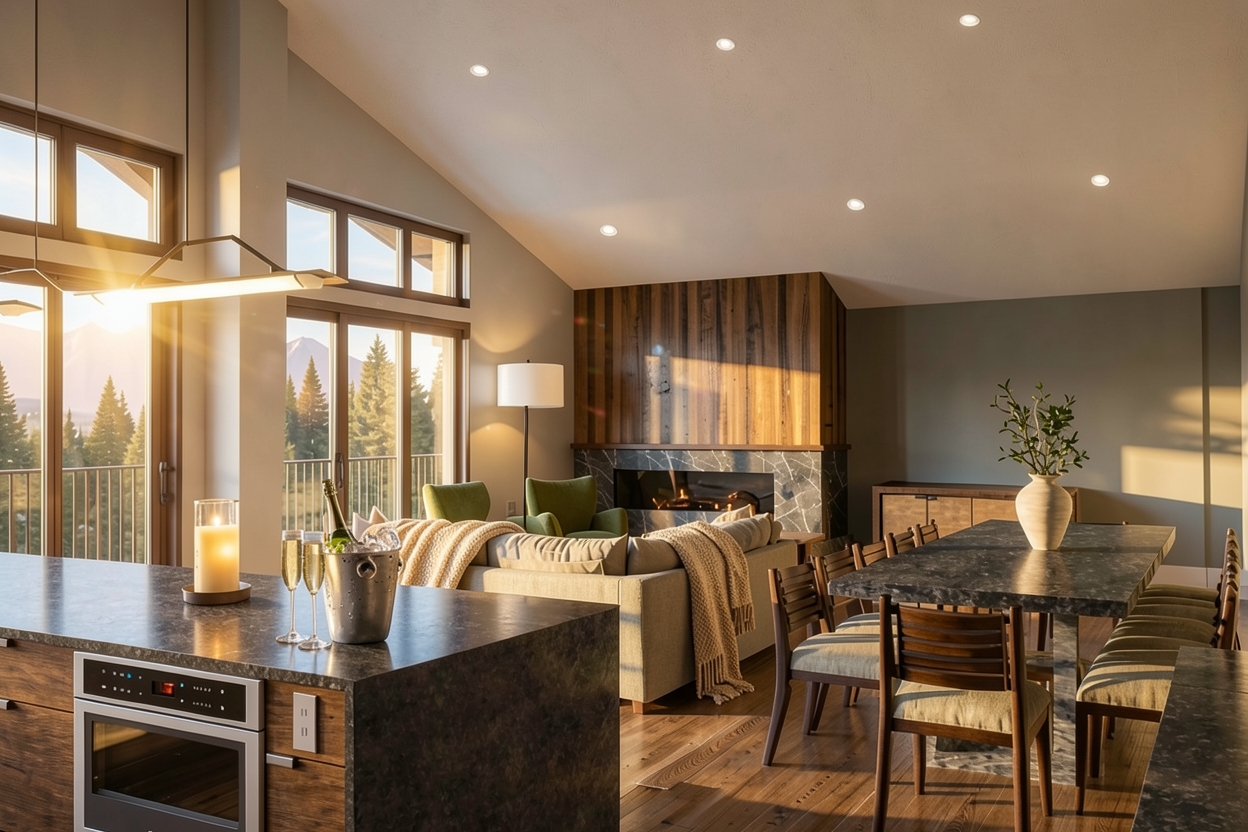 keep this image the same but remove just the candle on the counter keep the champagne bucket and make the view outside a pine and aspen three forest