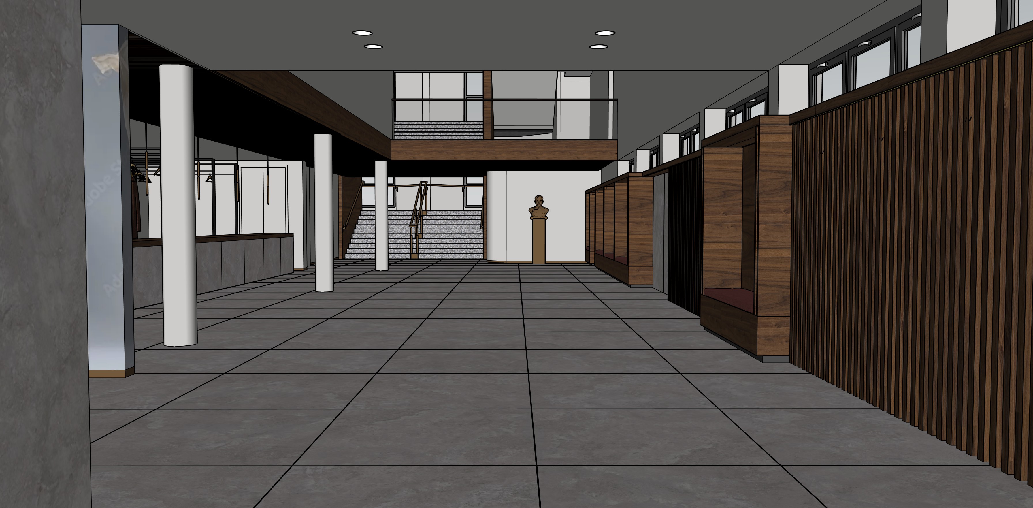 modern cultural building foyer interior warm light from window elegant people people also in front of picture stairs from grey marble copper handrails stairs and glass railing on upper level wooden frames with led light on the right with people sitting on them bronze bust one more lady closer to camera light interior matte floor led between lamellas spotlights hidden led lights on wooden frames horizontal led light between the wooden and ceramic parts of the counter