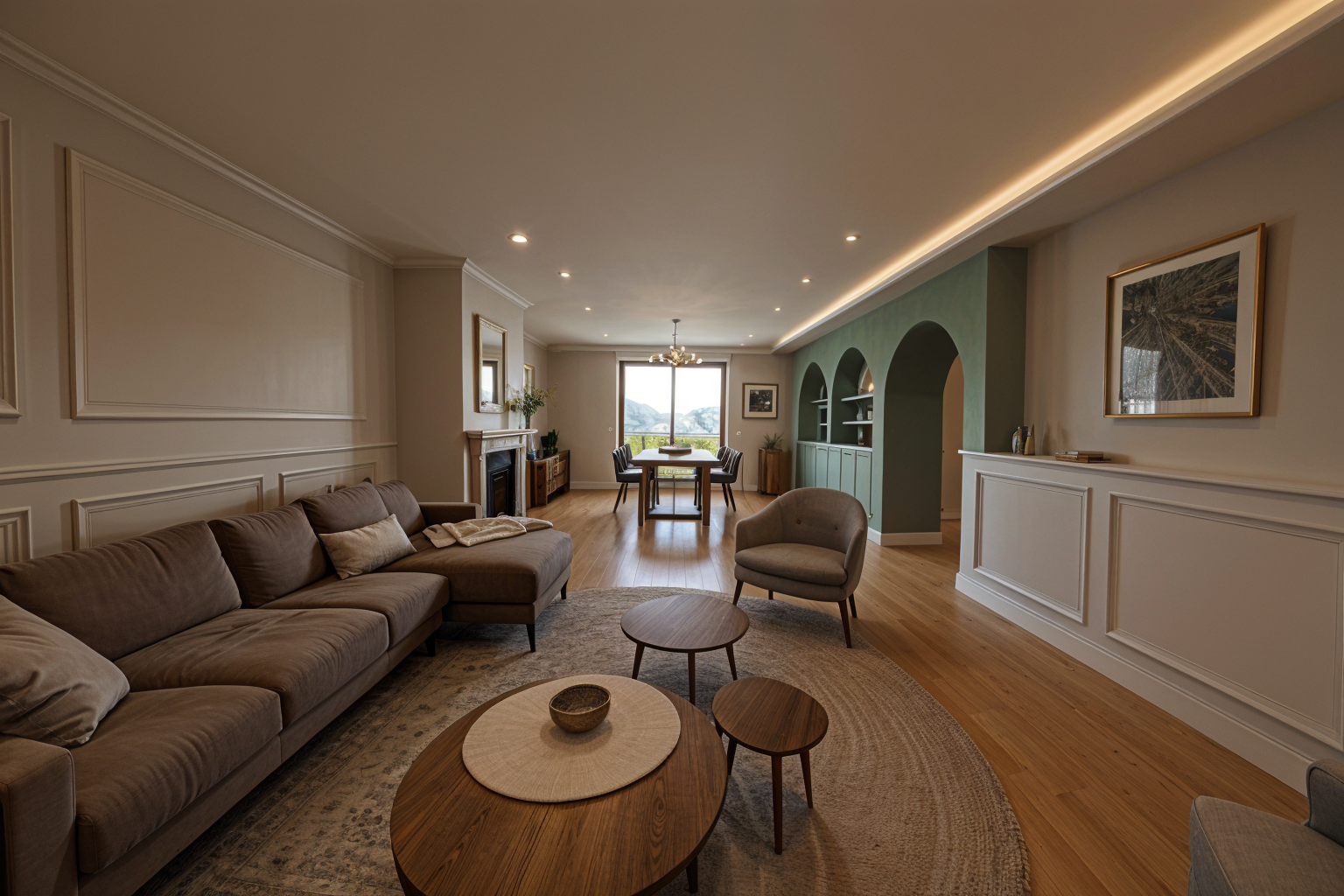 change geometric wall to acoustic panels of triangluar shapes of blue white grey change seating around the white tables to a modern fabric seating alternating colours of subtle blue whtie and grey make the carpet a laminate wood texture vinyl