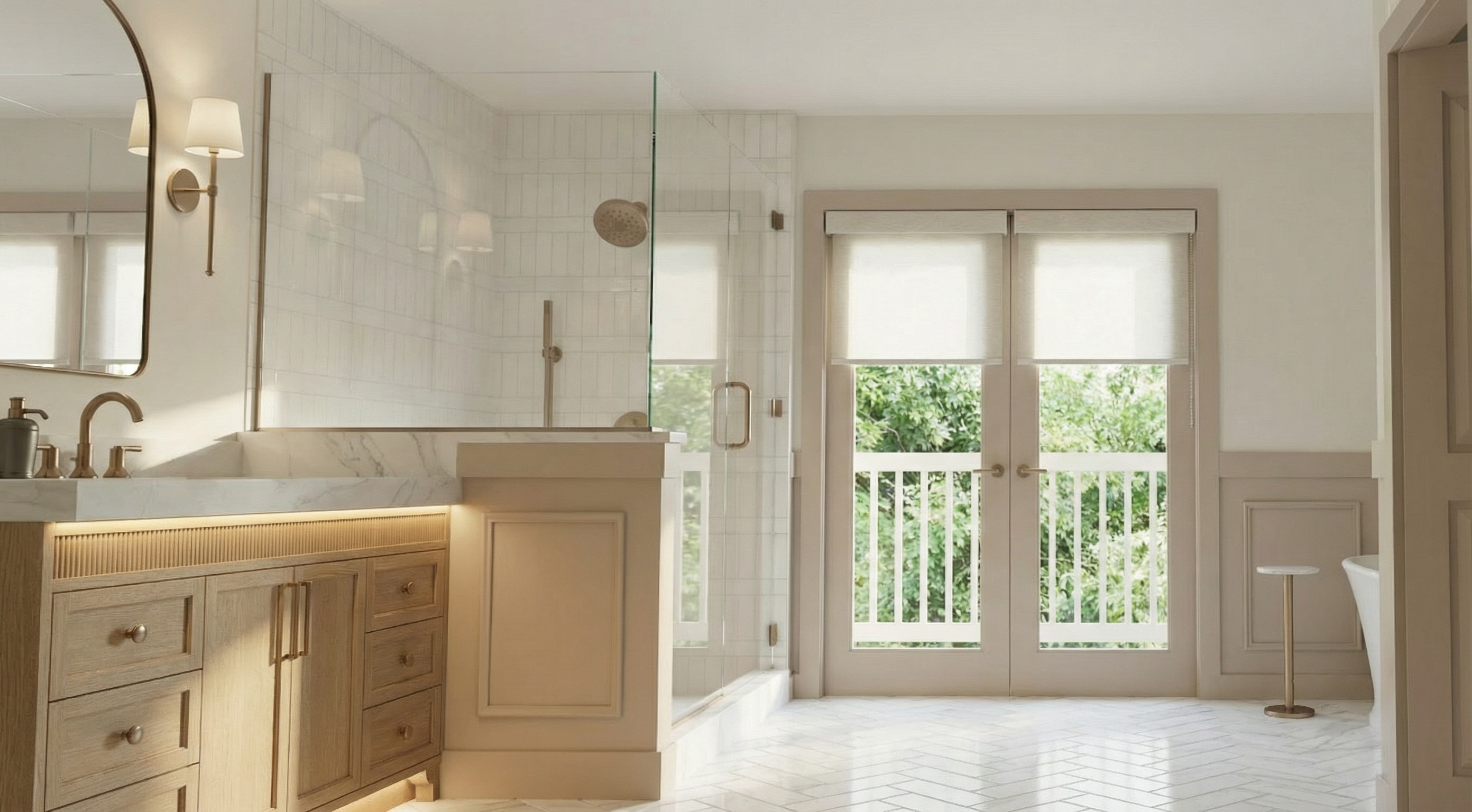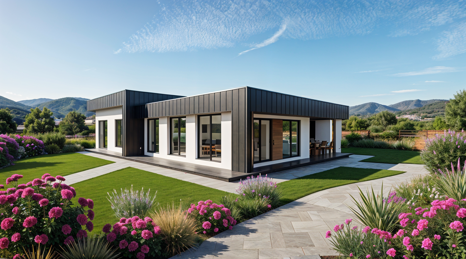 enhance the realism of the existing architectural design while maintaining the same materials and textures focus on realistic lighting shadows and surface details to create a lifelike appearance ensure the mixture of wood siding white siding and black sidng is preserved in the correct areas making them look authentic and cohesive this is in montana add montana landscape but nice landscaping near the house add montana vegetation around house make wood siding modern vertical 10 wider plank siding natural cedar light warm honey tone clear matte finish clean sharp edges minimal knots contemporary scandinavian farmhouse style high end residential exterior the siding is not board and batten it is wide planks with realistic wood grain texture do not change the driveway or the sidewalk make the vertical black siding nickel gap keep the white siding the same do not add sidewalk just do grass and landscaping in foreground