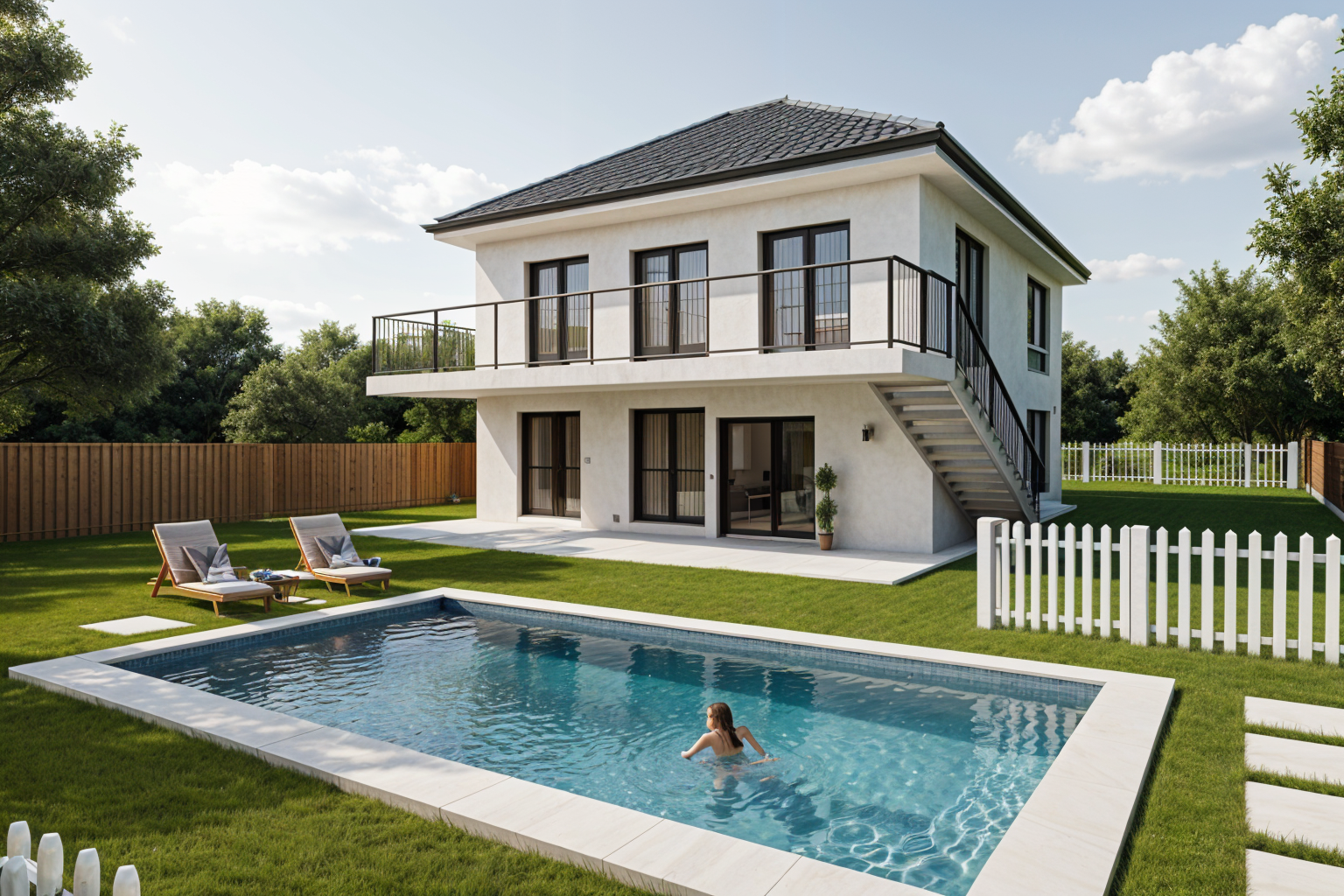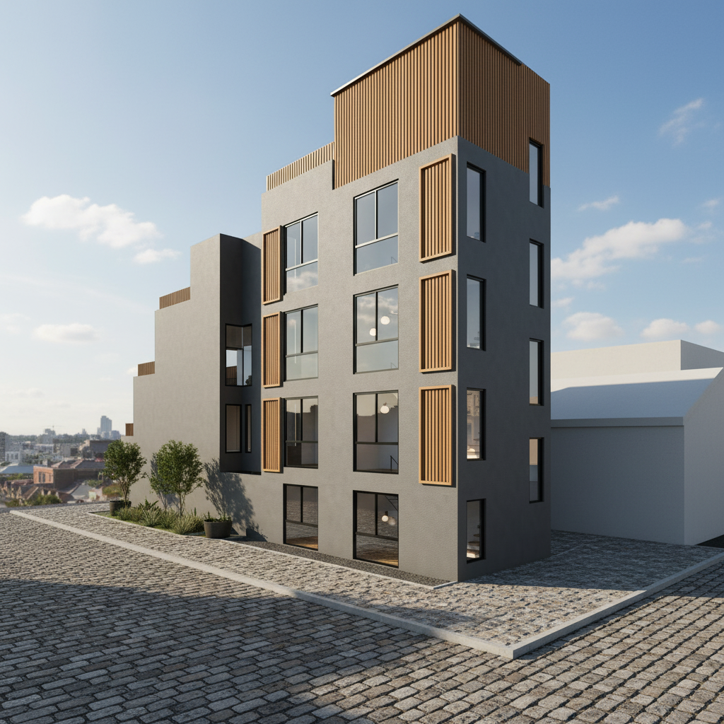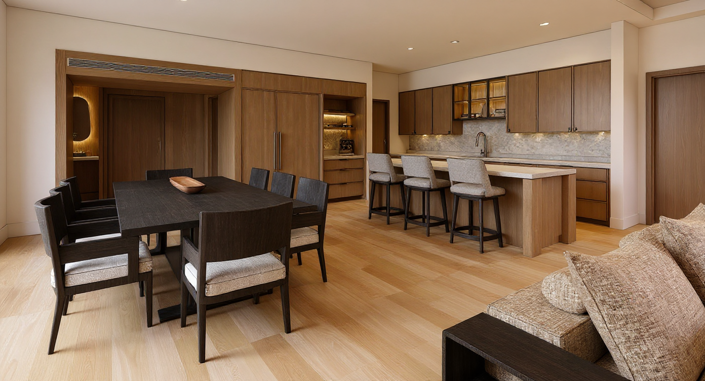 a modern stylish public restroom interior brightly lit with soft warm lighting the walls are painted in a calming light grey the floor is a sleek polished concrete in a darker grey tone elegant white porcelain fixtures including a row of three contemporary sinks with chrome faucets each under a large frameless mirror next to them four streamlined urinals with stainless steel partitions to the side a private cubicle with a sleek door housing a modern white toilet set the atmosphere is clean minimalist and calming with a focus on simplicity and functionality architecture
