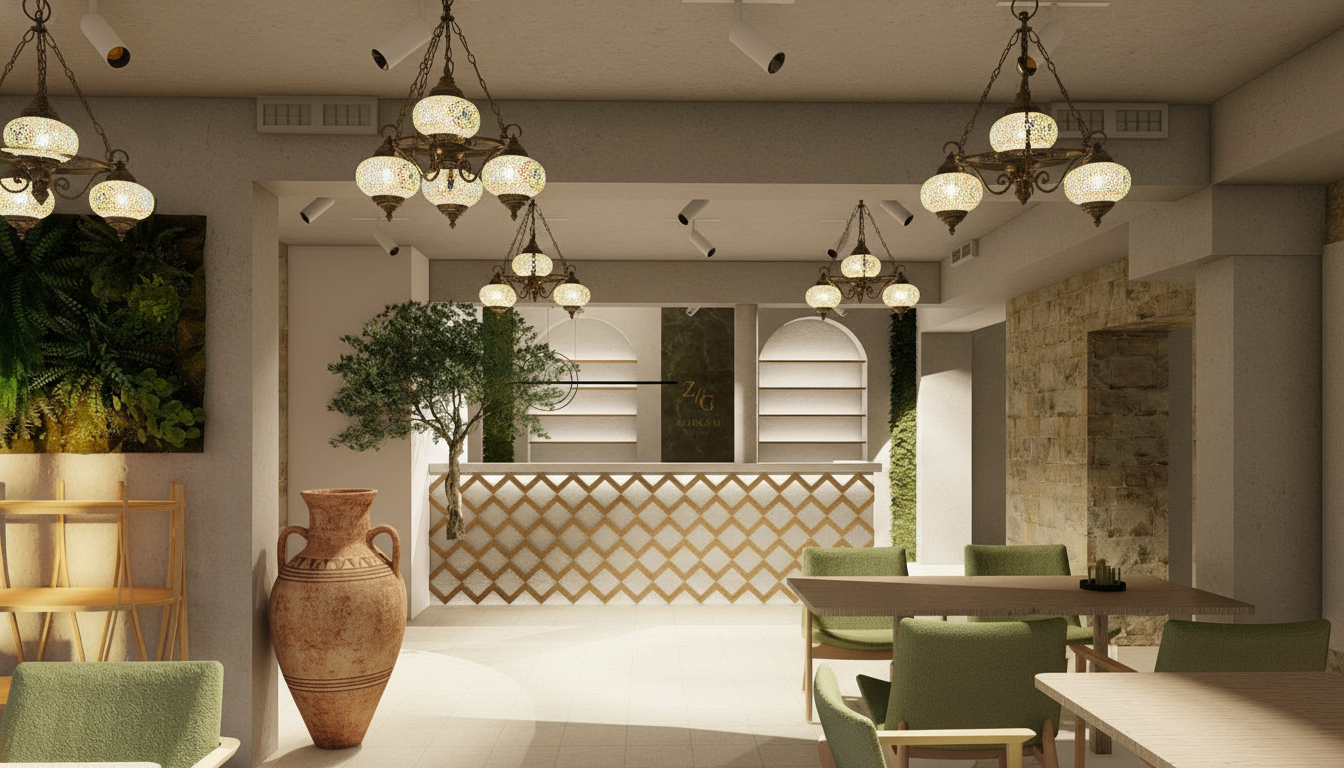 keep everything in the scene exactly the same geometry layout materials and camera angle only add hanging plants falling softly from the ceiling and improve the overall lighting to look more natural and warm do not change or move anything else and do not reduce image quality just make the lighting and plants look realistic and beautiful