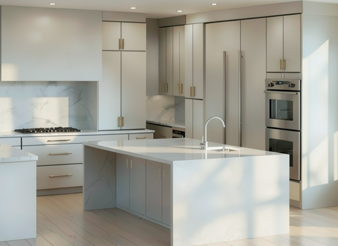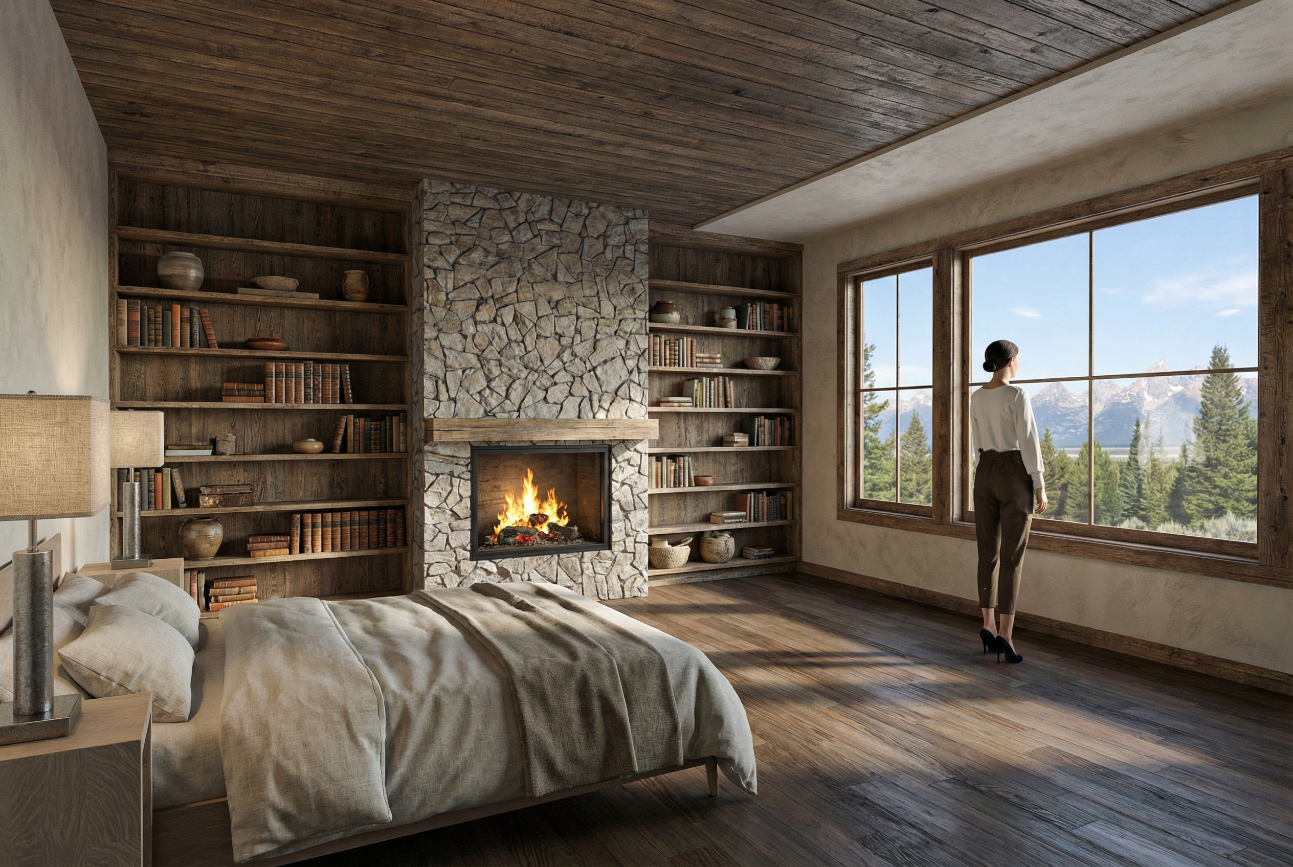 mountain modern single story house with a warm and inviting atmosphere featuring a roycroft bottle green and iron ore accent and black fox trim exterior black grey asphalt shingles and the beams should be woodscapes hawthorne sw3518 the house has a prominent wood framed gable entrance surround it with lush green grass and mix of landscape and hardscape and add a smooth asphalt driveway with concrete sidewalk leading to the entrance the sky is clear and bright blue with misty white clouds enhancing the tranquil and sunny setting set in a field in a valley