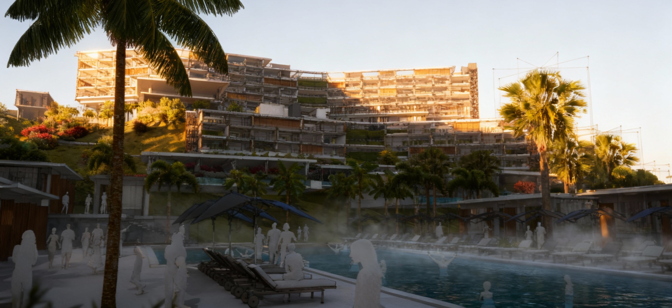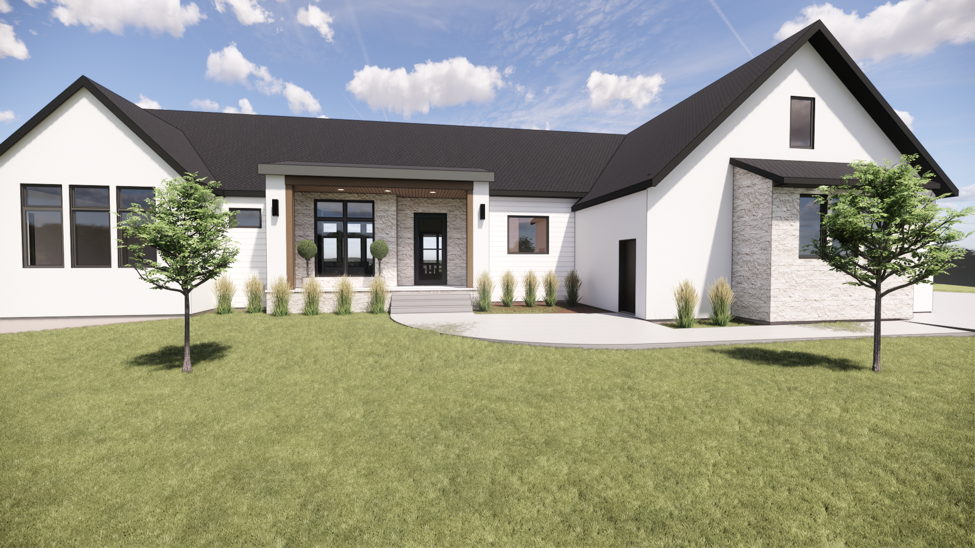 render a photorealistic 3d perspective of this house maintain the original features add more landscaping and trees