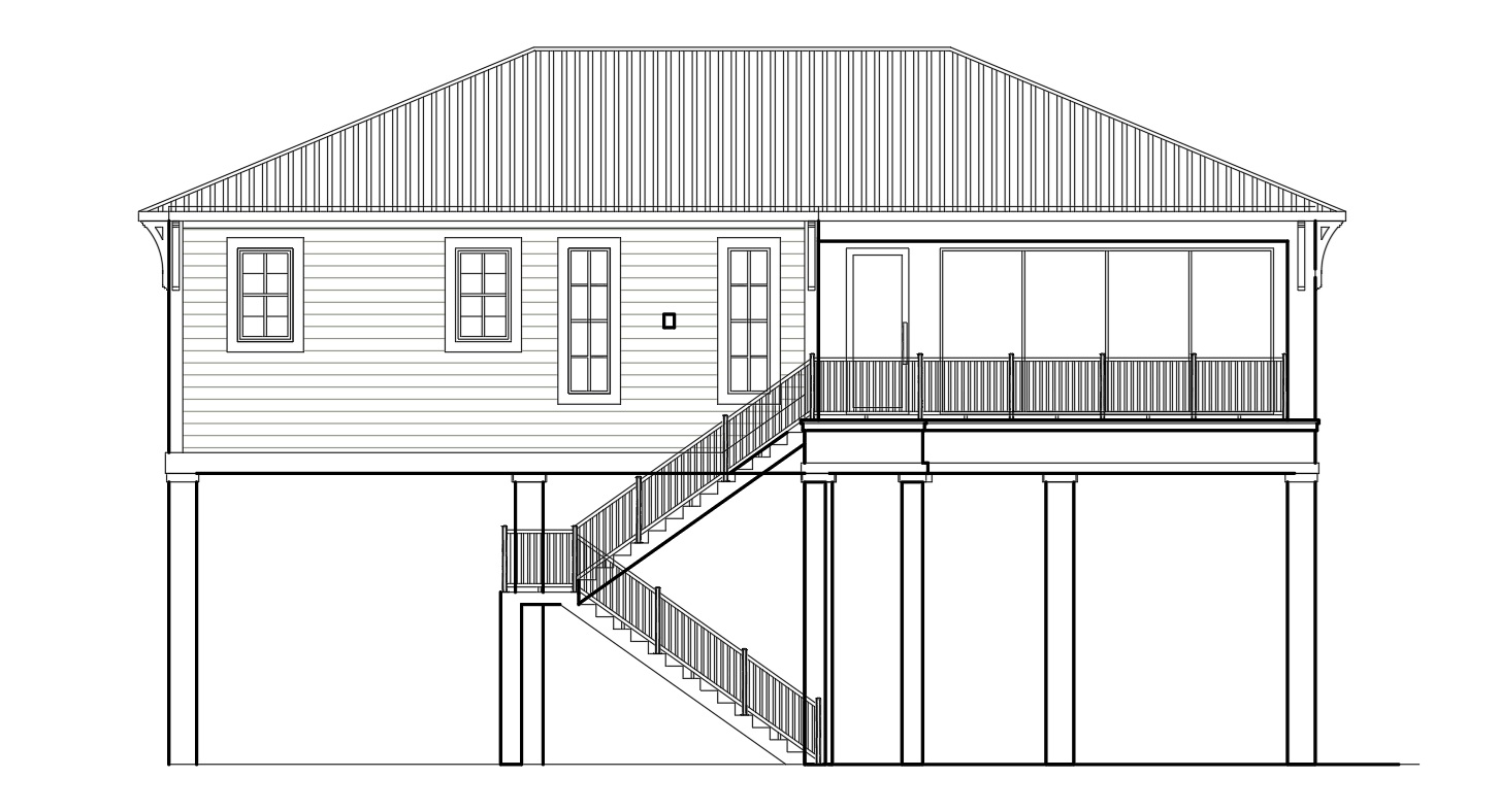 create a photorealistic rendering of a luxury coastal modern residence this is house on stilts no walls on ground floor only 16 x 16 columns with a bright white 7 hardi plank on the left portion and with metal gray roofing the window framinng are all white while the glass are gray tint the railings are all in white color the brackets are also white surrounded by lush greenery in florida setting surround it with palm trees and a dawn setup with lights lit up and the house shows swimming pool at the rear of the house sand in the foreground as this is a beach area